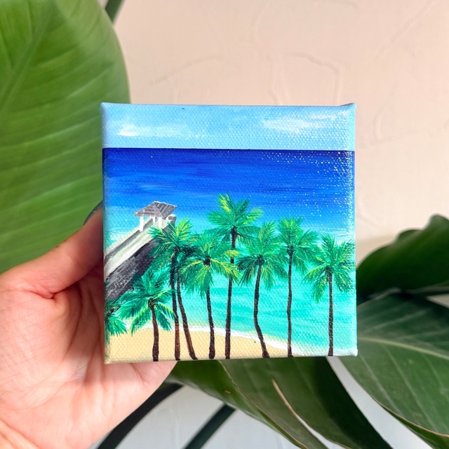 雨季のハワイ、ワイキキビーチ。 Twin Fin ホテルのオーシャンフロントのお部屋から眺めた、晴れた朝の景色を描いた小さなキャンバスアートです。 ヤシの木の向こうに広がるターコイズブルーの海は、朝日を受けてきらきらと輝き、 「ハワイに来たんだ」と心から実感する、あの胸が高鳴る瞬間を思い出させてくれます。 10cm四方の小ぶりなサイズながら、厚みのあるキャンバス(37mm)が存在感を生み、 お部屋の棚やデスク、玄関、ベッドサイドなど、さりげない場所に南国の空気を運んでくれる一枚です。 毎日の暮らしの中で、ふと目にしたときに心がゆるみ、 ハワイの風と光を感じられるような作品になることを願って制作しました。 こちらの商品は原画となります。 ※本作品の著作権はアーティストに帰属します。 原画をご購入いただいた後も、作品の複製・転載など、著作権を侵害する行為は固くお断りいたします。 【サイズ】 縦100mm 横 100mm 幅 37mm 【作品Morning Sparkle at Waikikiについて】 ・一点一点、心を込めて制作したオリジナルアートです ・淡い色合いのため、リビングや寝室、ワークスペースにも自然に馴染みます ・ハワイが好きな方、大切な方へのギフトにもおすすめです ⸻ 【ご購入前にご確認ください】 ・原画のため、写真と実物で色味が若干異なる場合があります ・キャンバス作品の特性上、多少の凹凸や筆跡がございます ・ご理解いただいた上でのご購入をお願いいたします