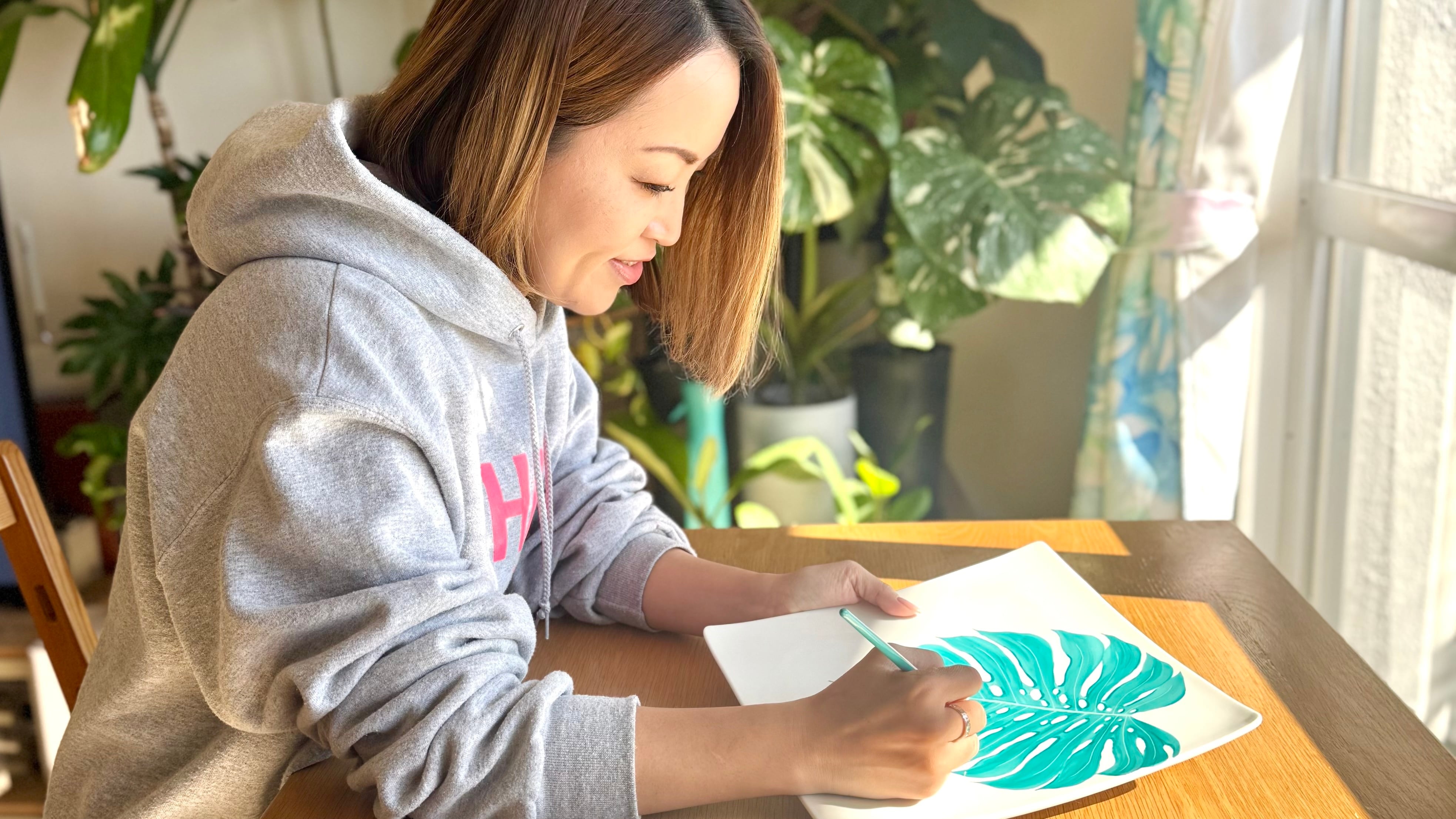 最新作である食器ブランド『Lea Makana』の「Pink Palace Garden」シリーズは、ハワイの伝統あるホテルで過ごした朝の記憶から生まれました。 優しいピンクの壁、風に揺れるバナナリーフ、そして穏やかな日差し。 あの場所で感じた「時が止まったような幸福感」を、毎日の暮らしの中で感じていただけたら——そんな想いを込めて、一点一点、筆を走らせています。