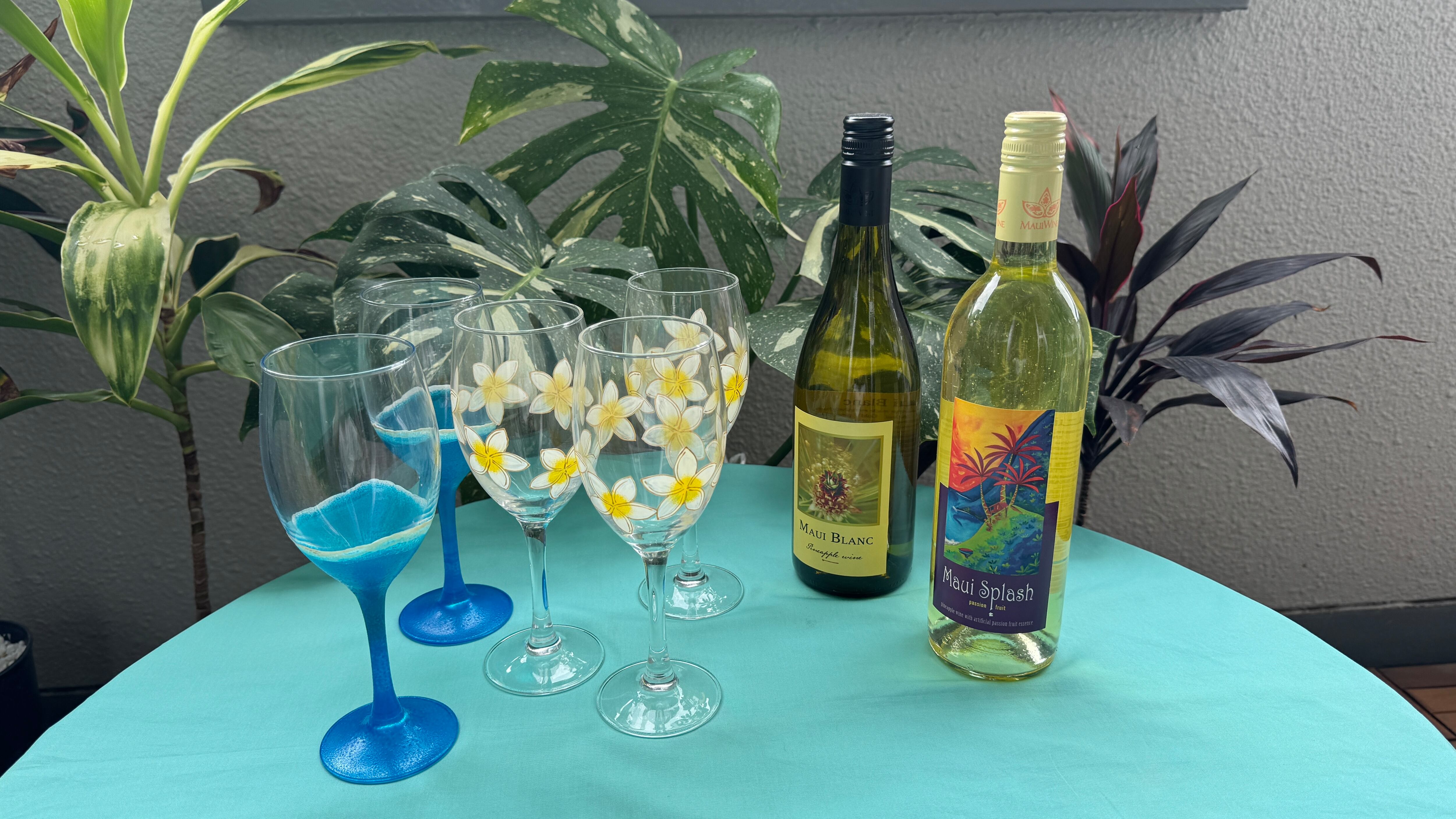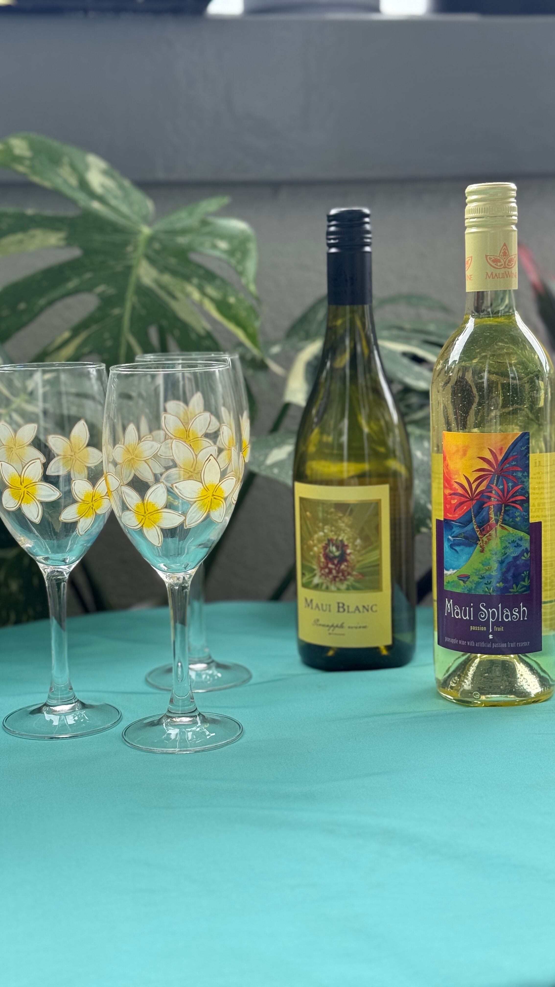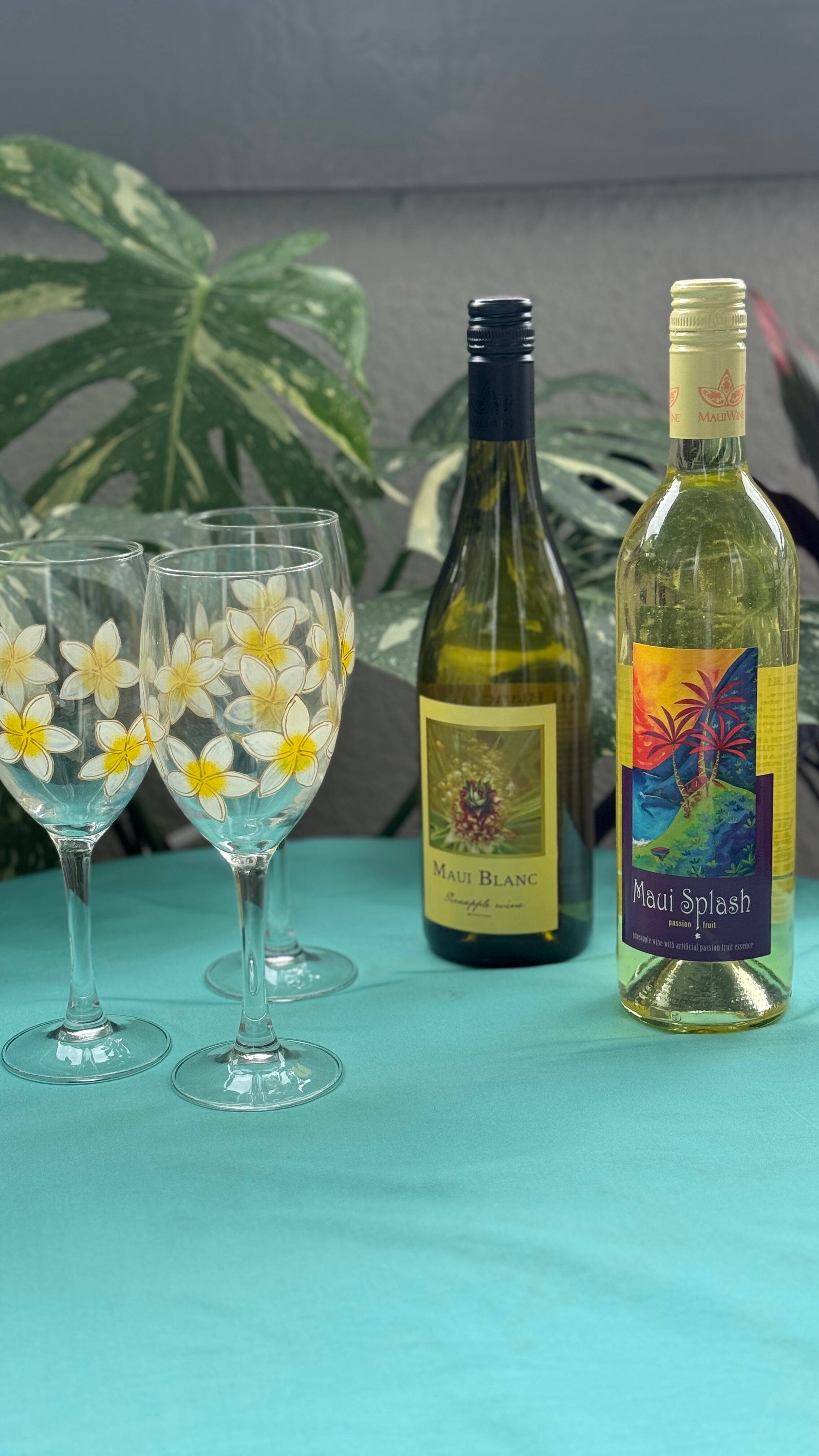 ワイングラスに手描きのホワイトイエローのプルメリア柄がぐるり1周入ったグラスです。