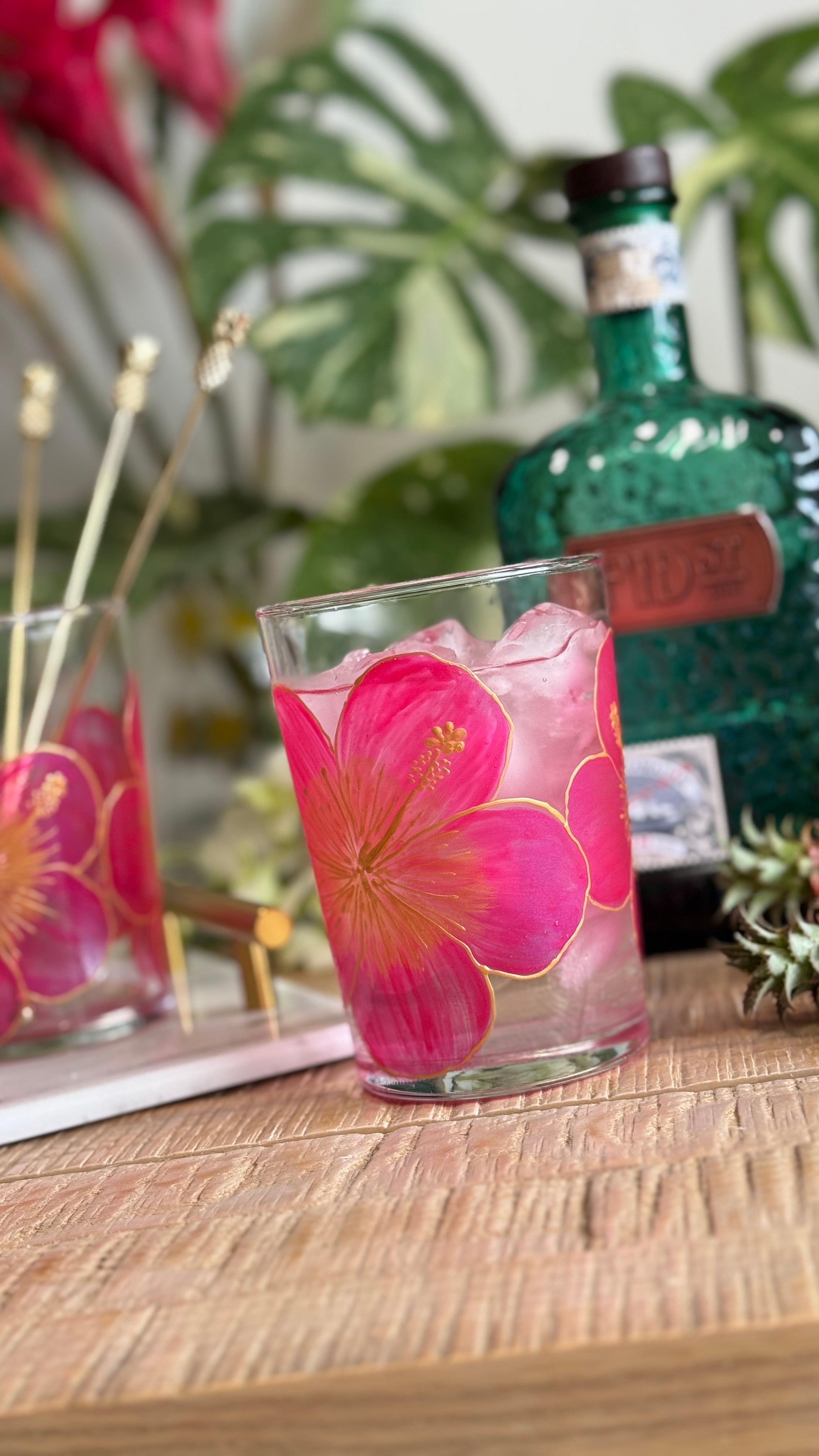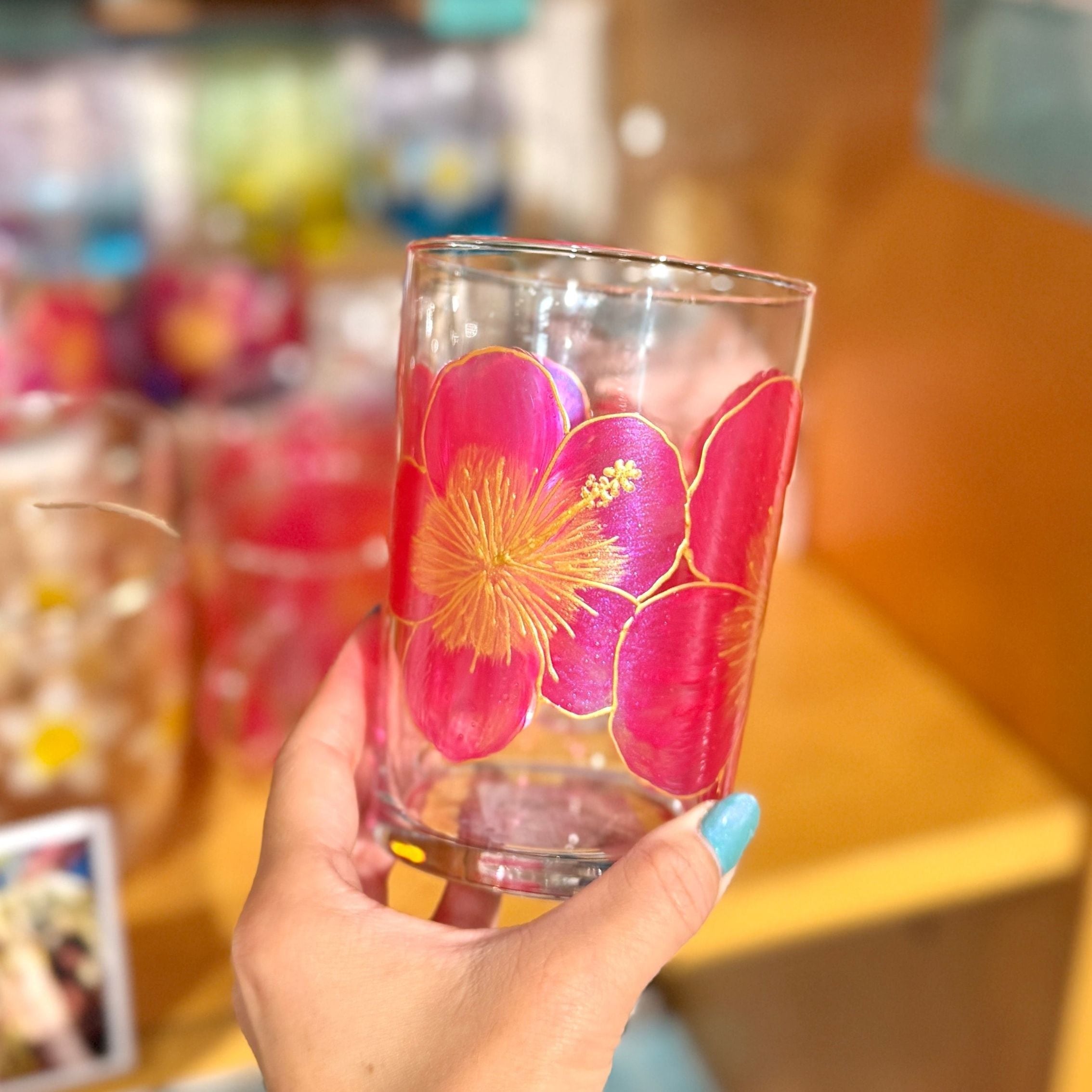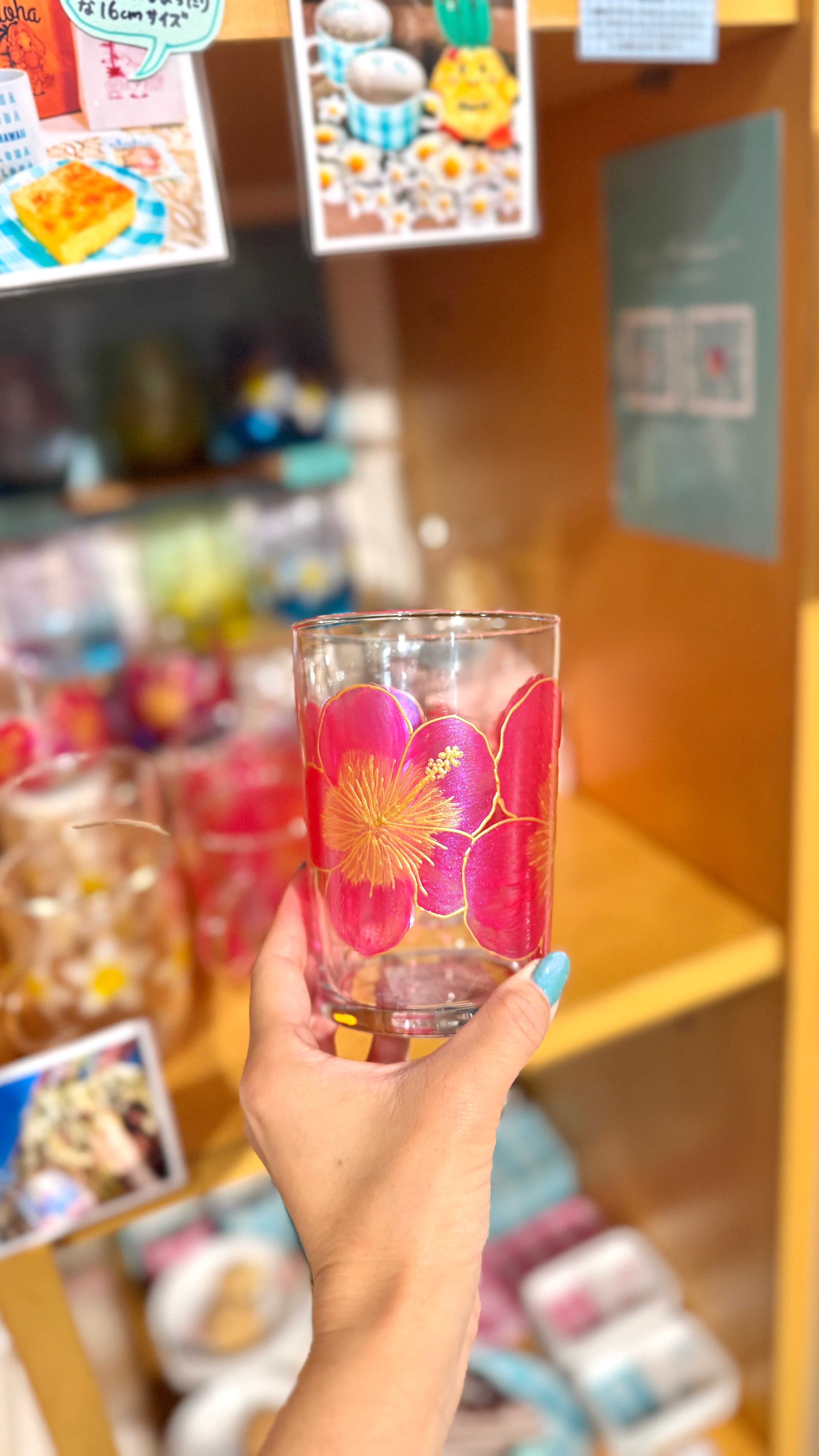 大容量グラスに手描きの大きめハイビスカスが入ったグラスです。