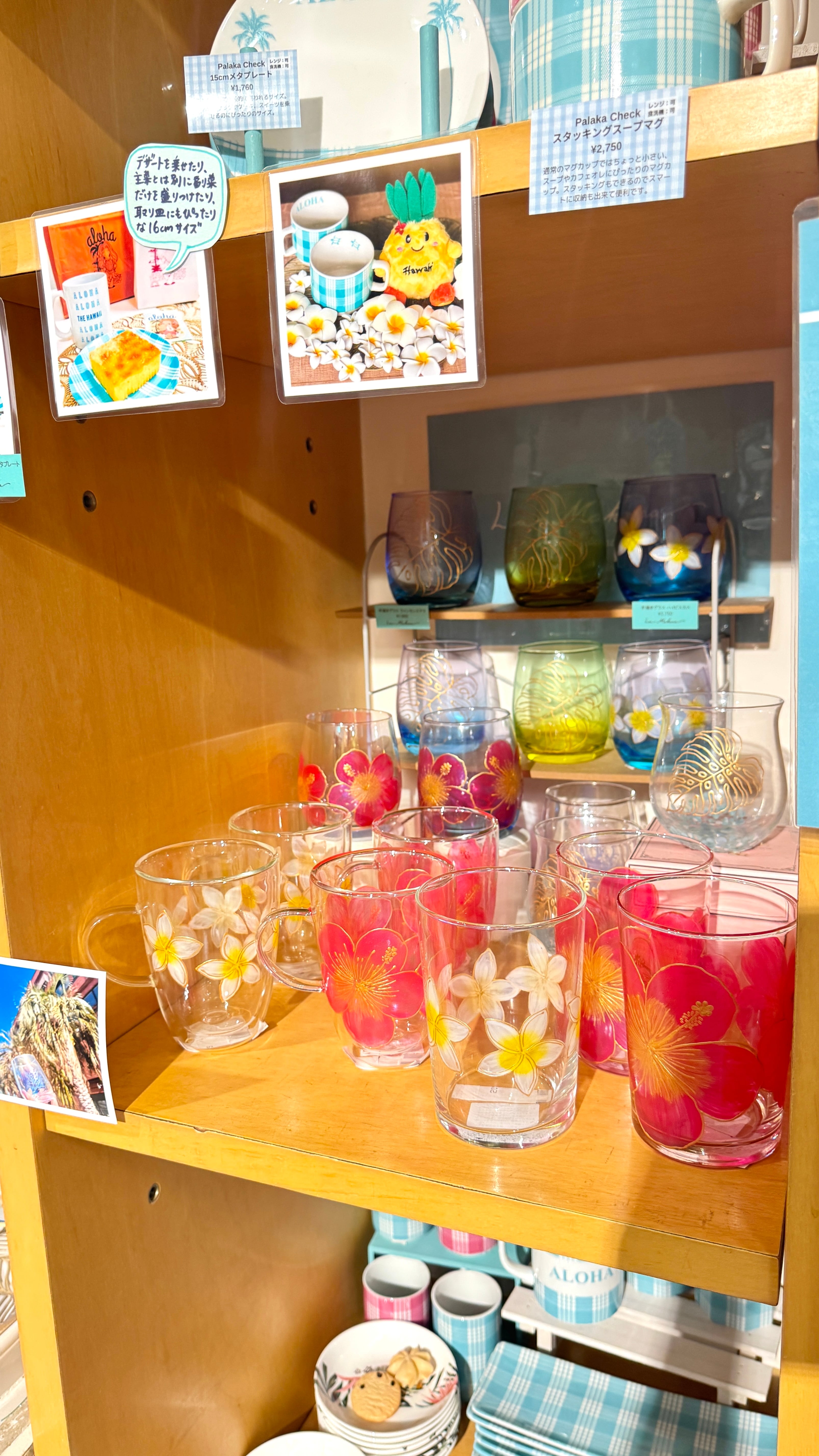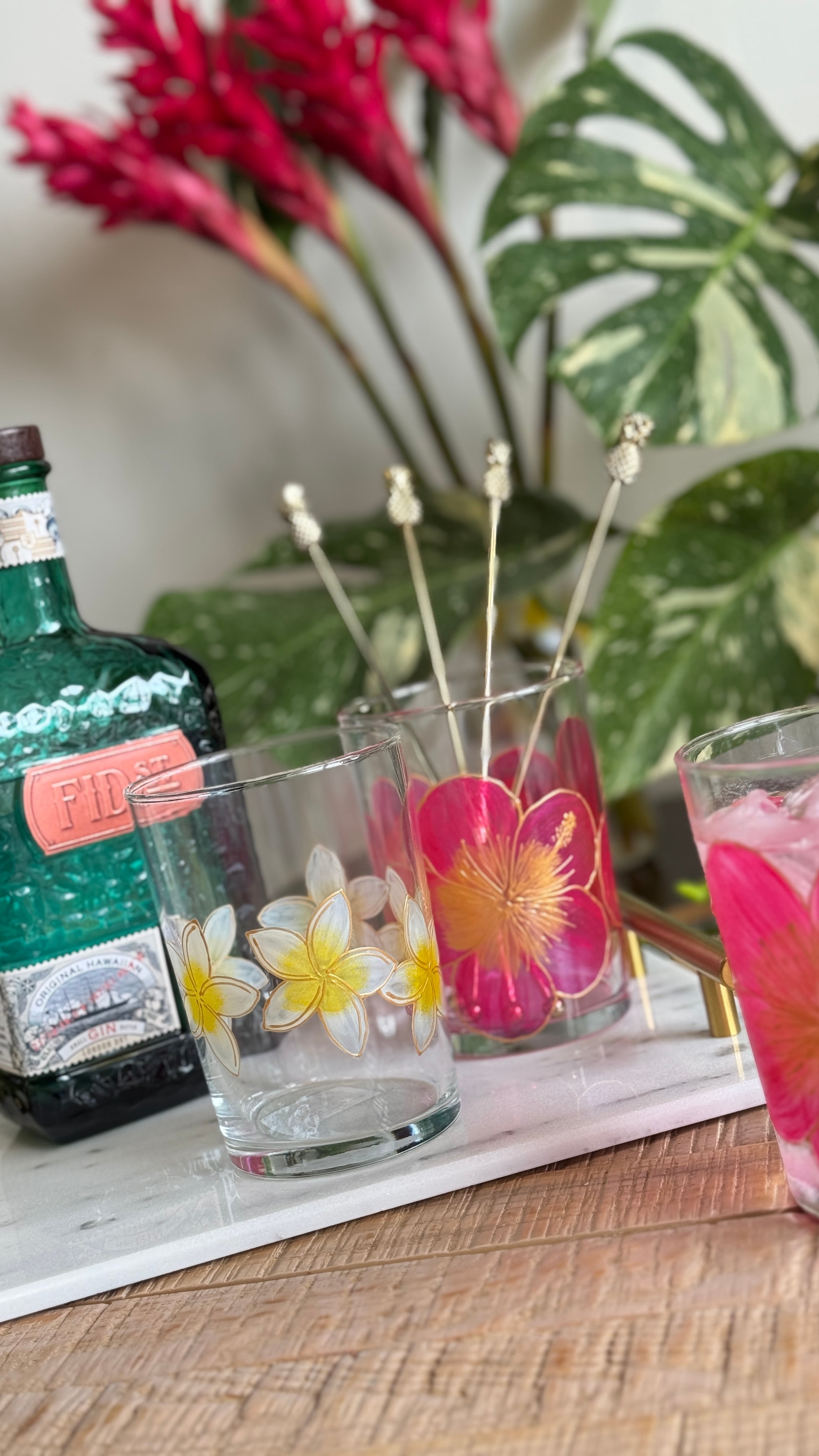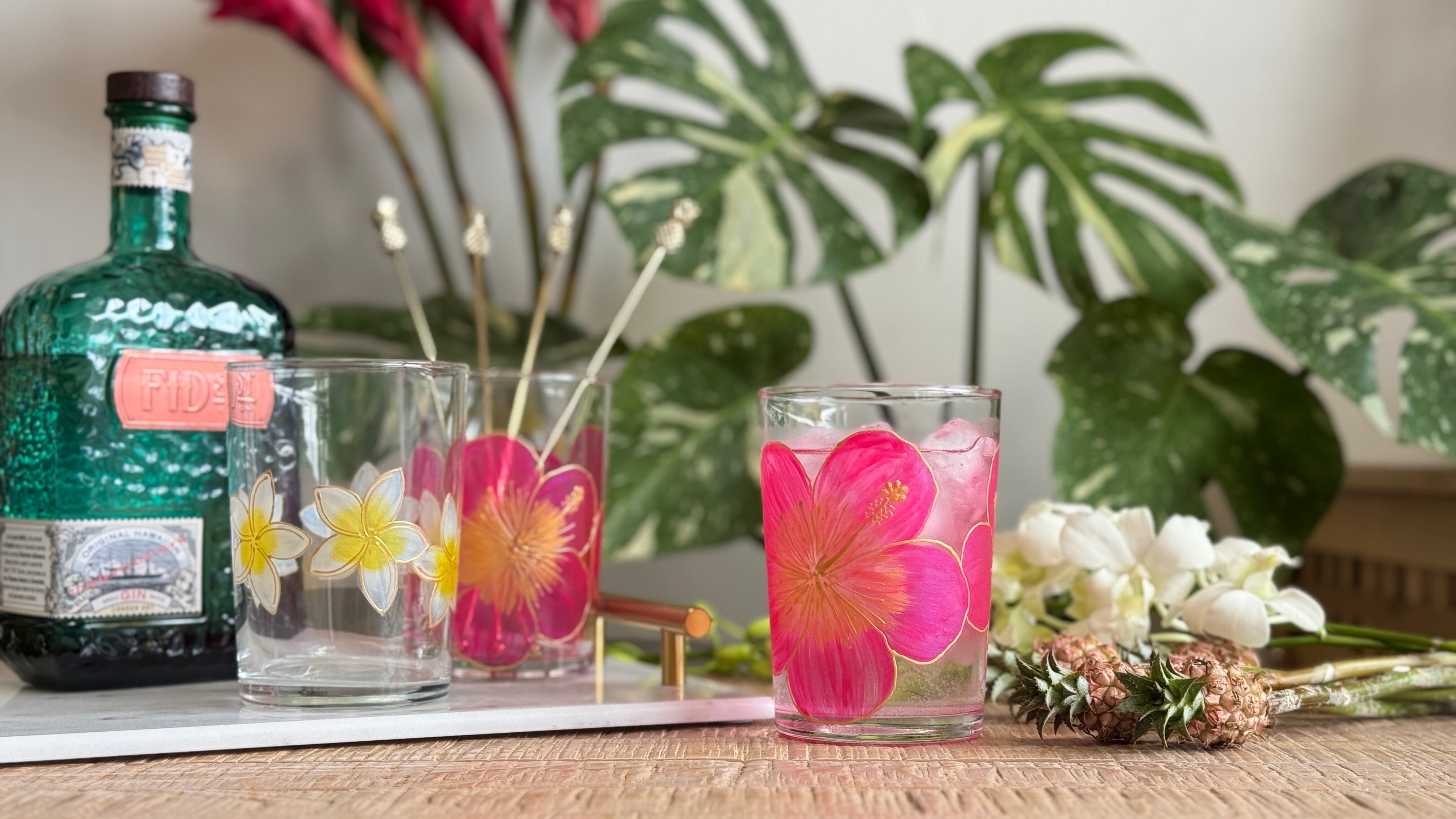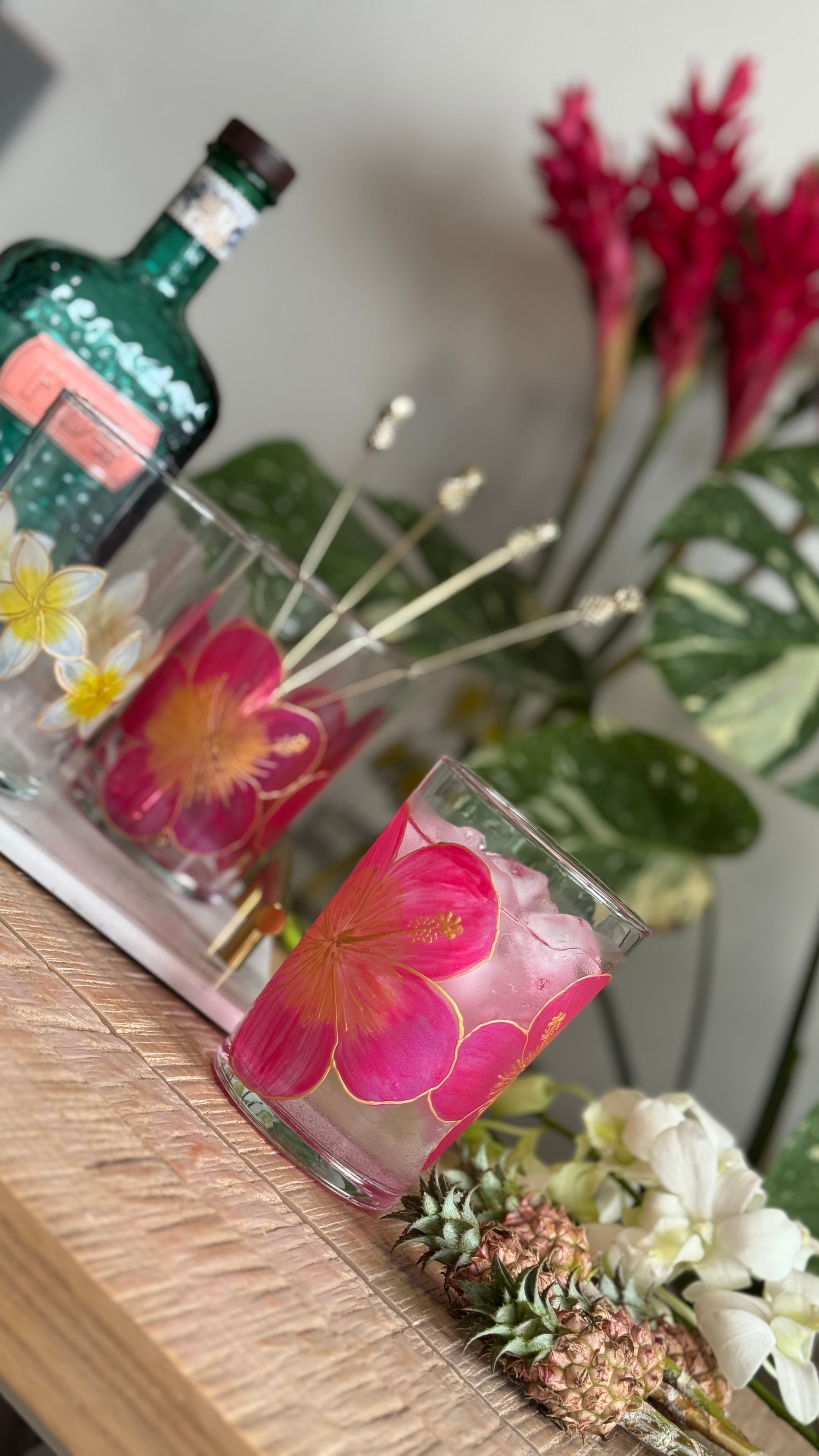 大容量グラスに手描きの大きめハイビスカスが入ったグラスです。