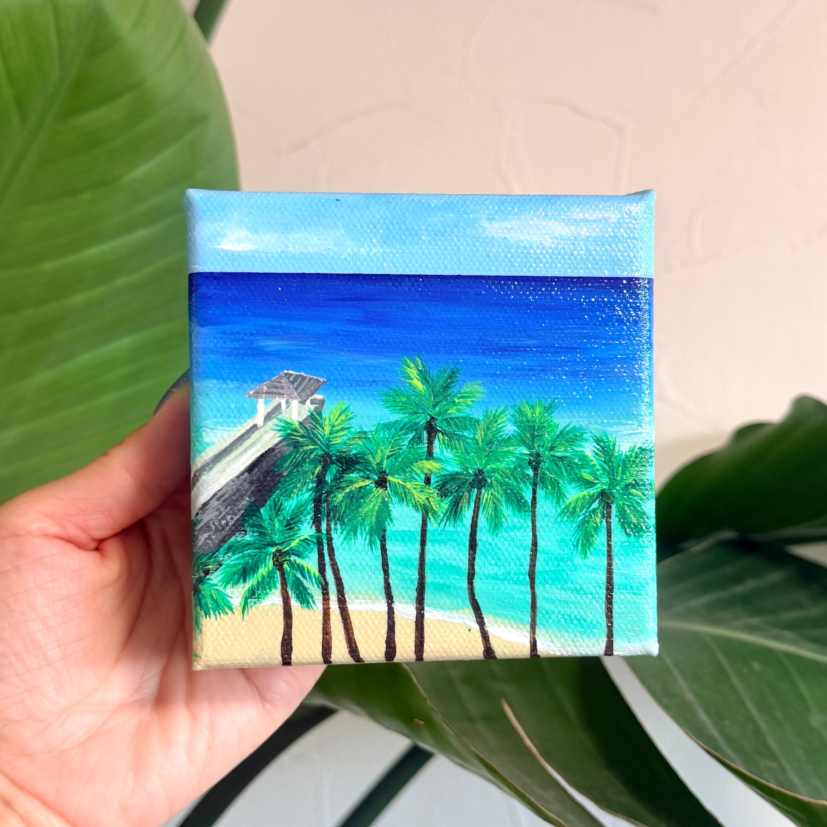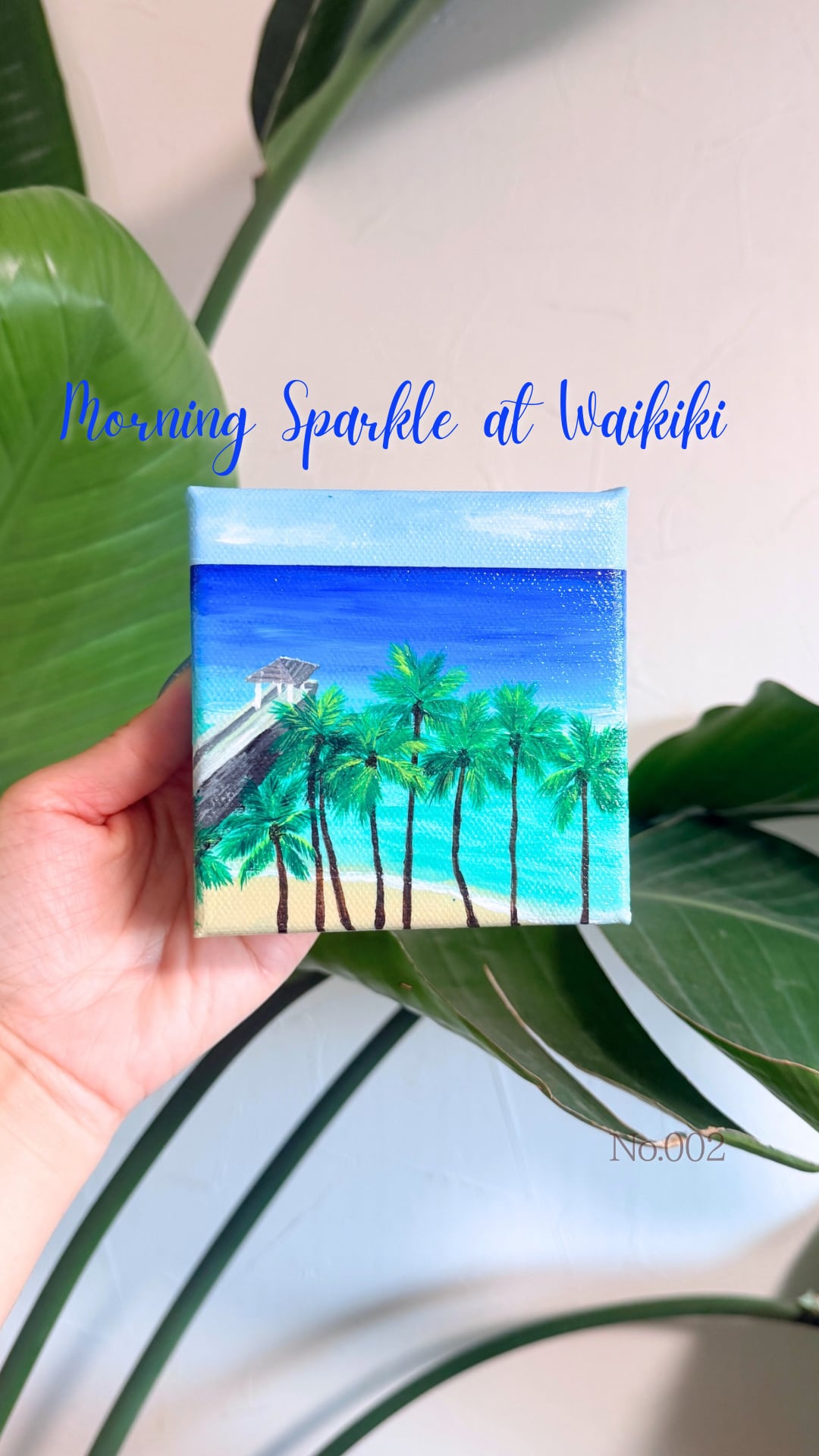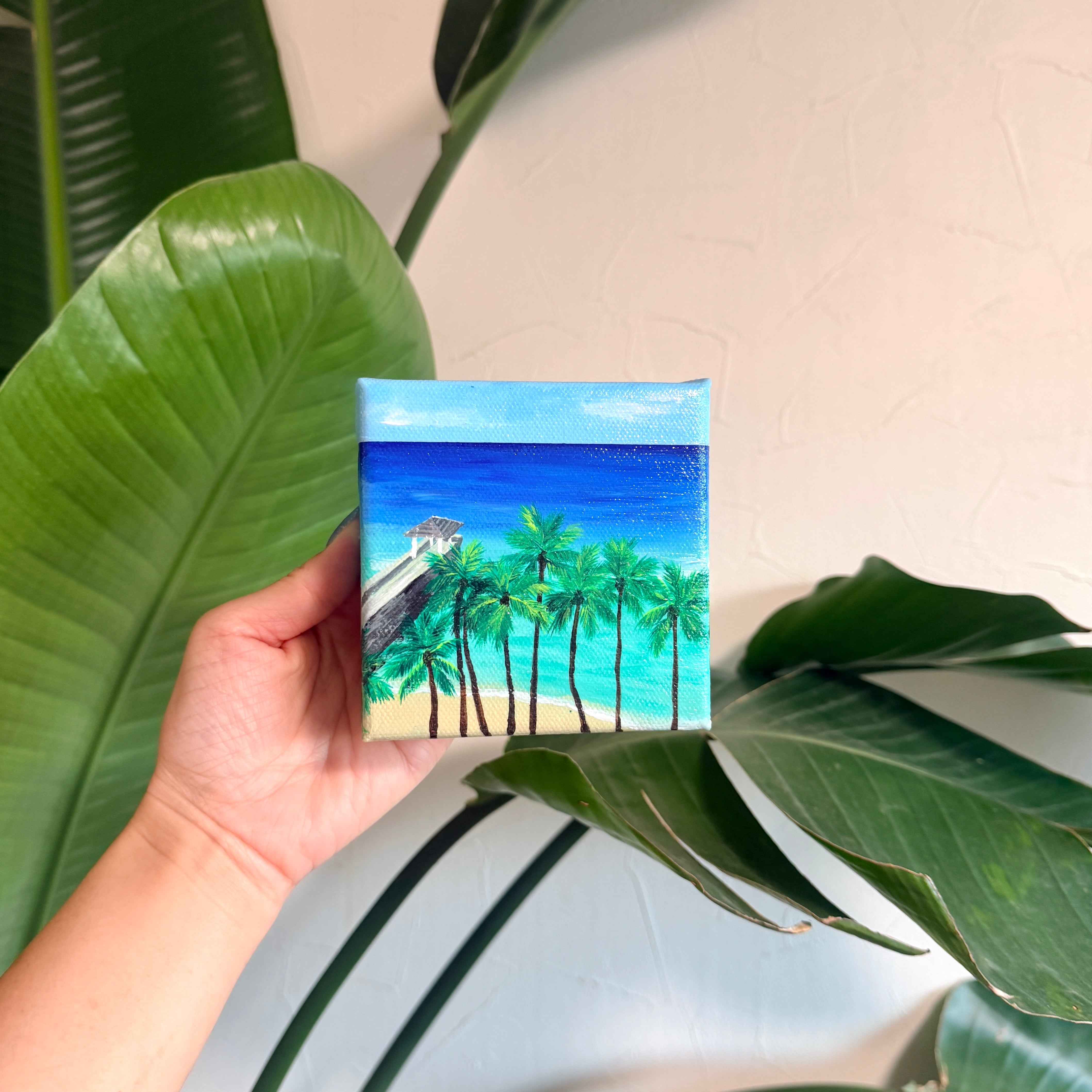 Twin Fin ホテルのオーシャンフロントのお部屋から眺めた、晴れた朝の景色を描いた小さなキャンバスアートです。