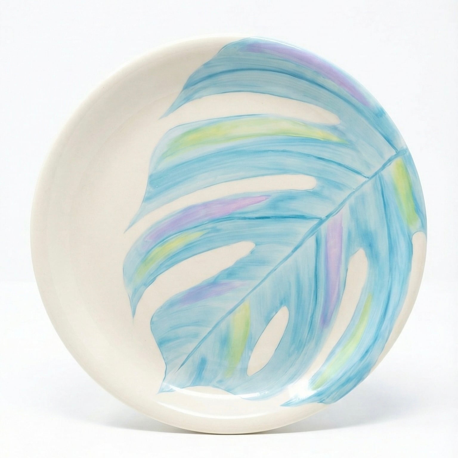 大胆に描かれたモンステラの葉が目を引く、アーティスティックなプレートです。