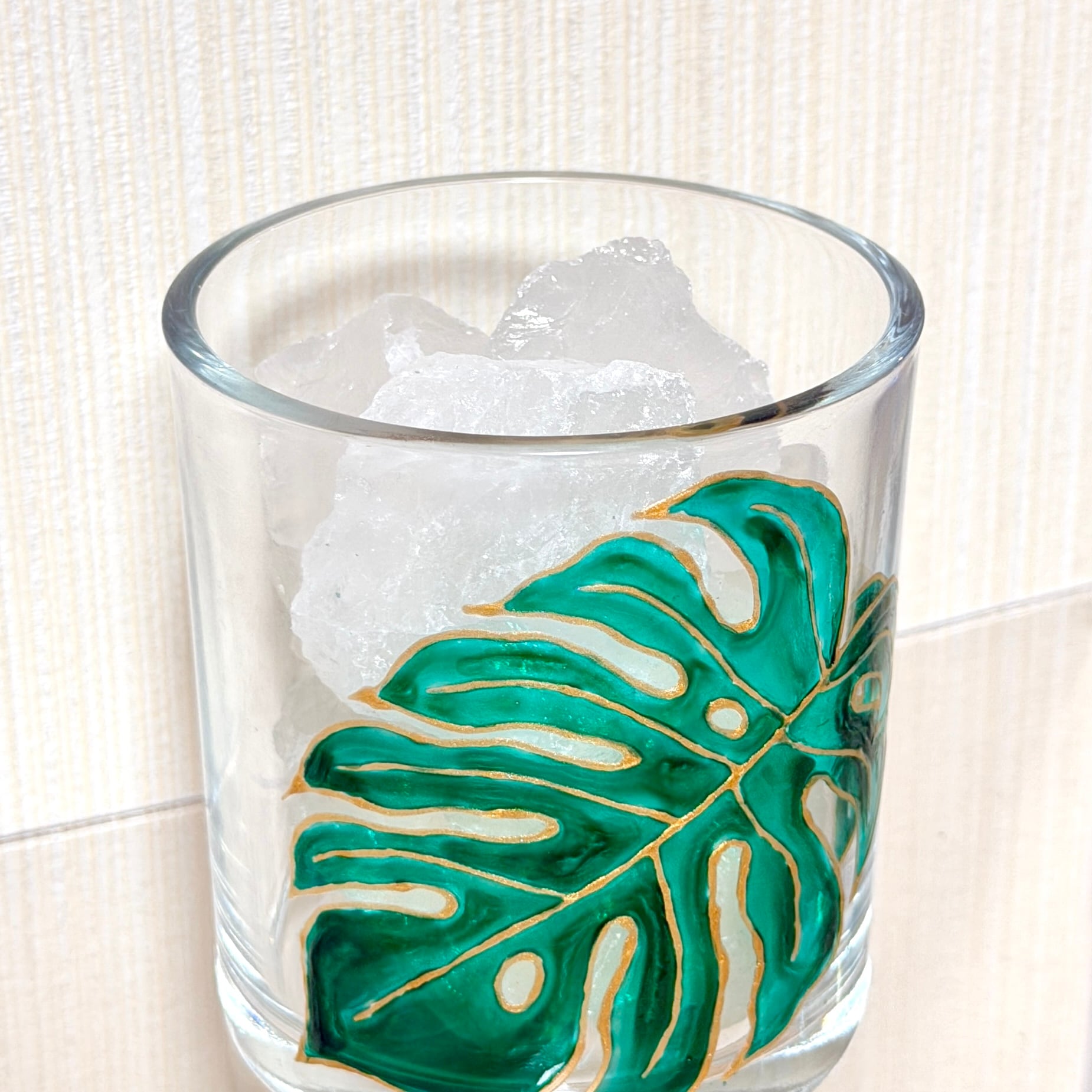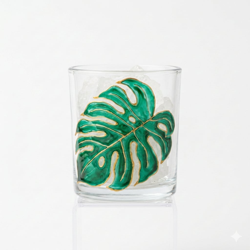 透明感のあるグラスに、深いグリーンと繊細なゴールドの縁取りで描かれた「モンステラ」。