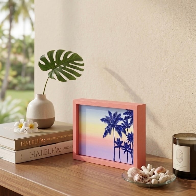 サーモンピンクのフレームが、夕陽の温かさをより一層引き立て、眺めるたびに心が解き放たれるようなリゾート感を演出します。