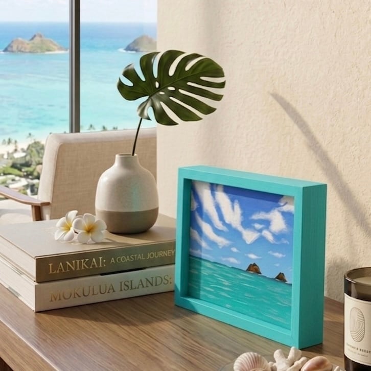 ターコイズブルーのフレームが、アートの海の色と溶け合い、空間をパッと明るく彩ります。忙しい日常の中で、ふと目を向けた瞬間にラニカイの開放感を感じていただけるような一点です。