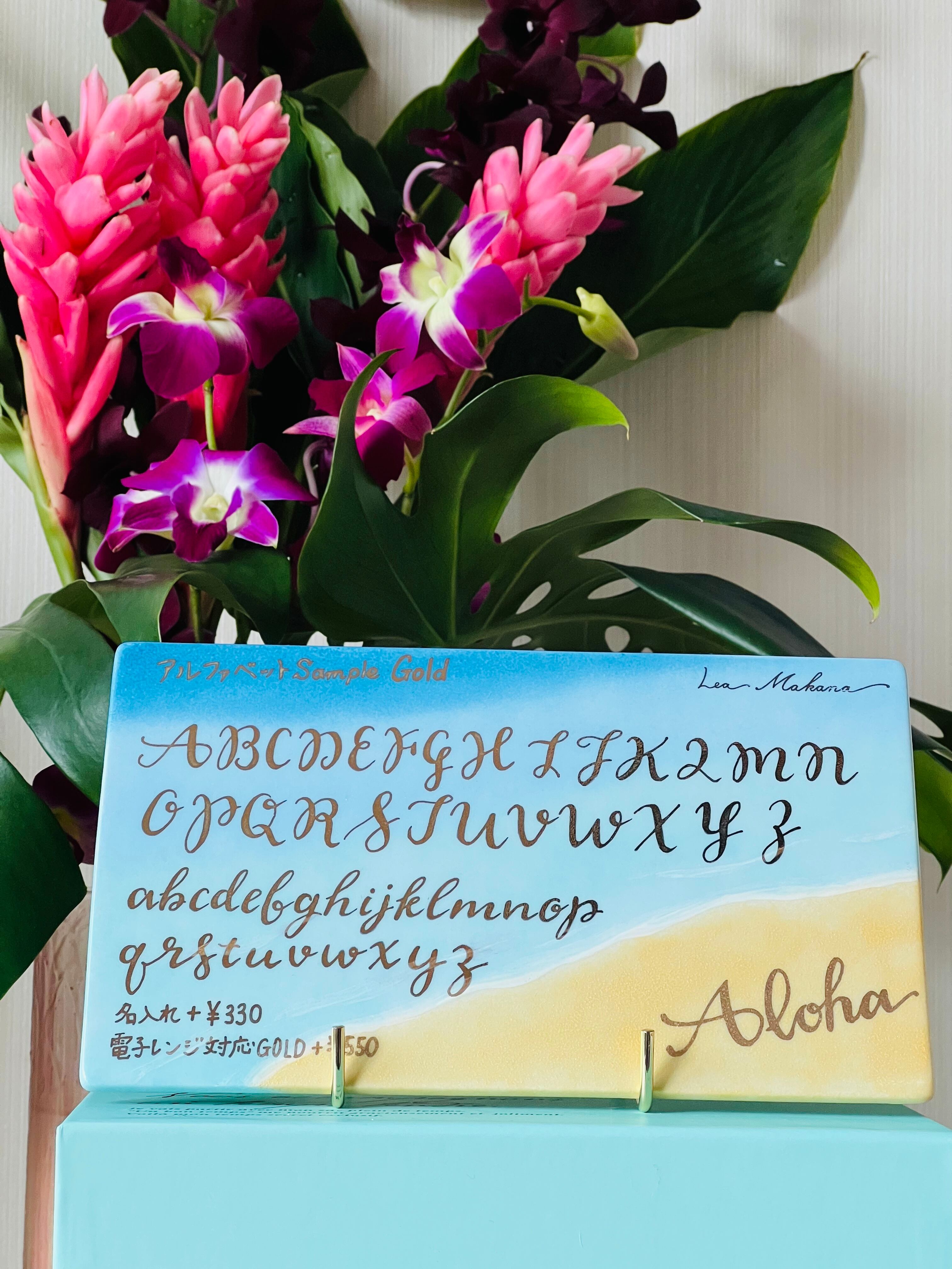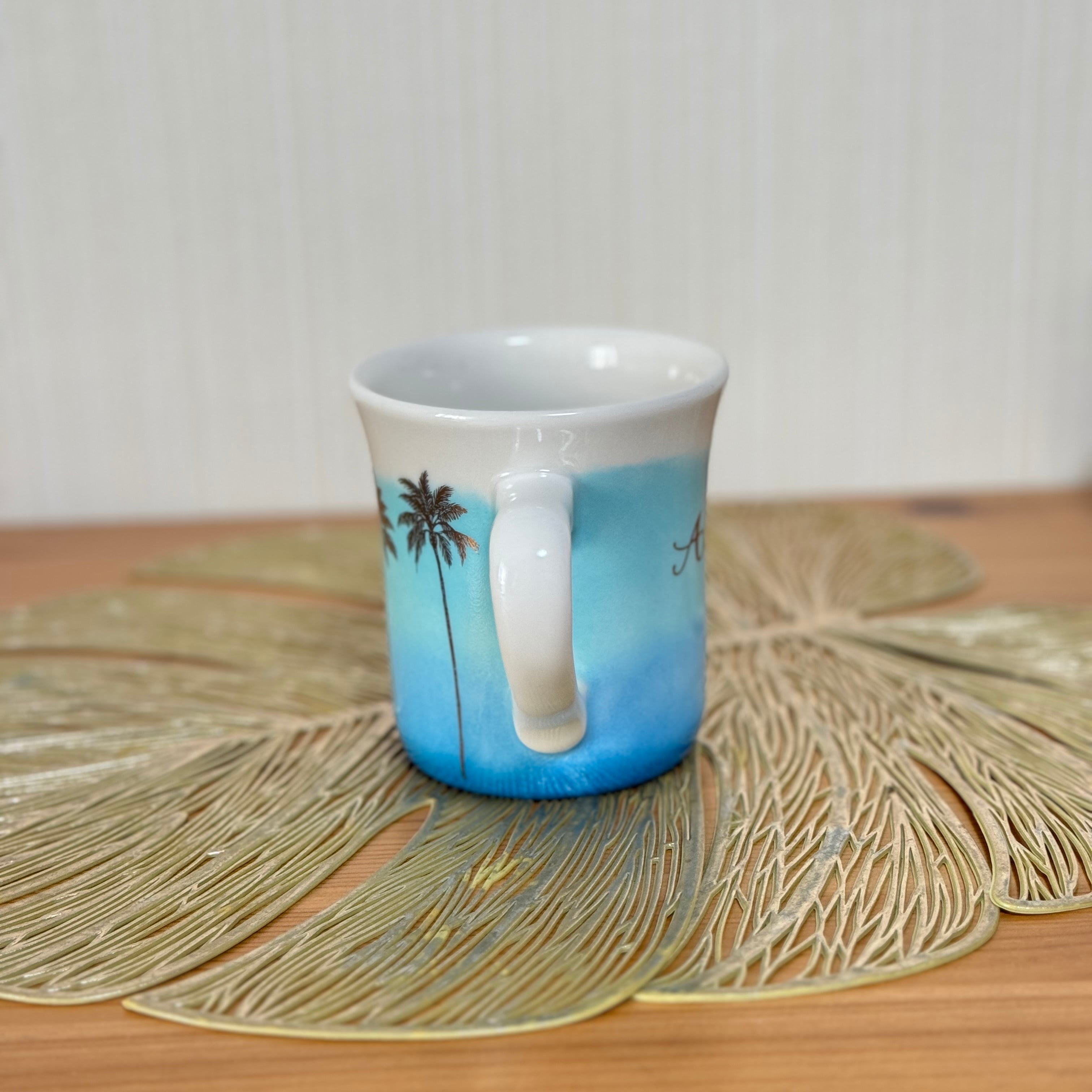エメラルドグリーンのグラデーションを一点一点手作業で色付けし焼き、その後電子レンジ対応ゴールドでヤシの木柄とAlohaを入れて焼いています。