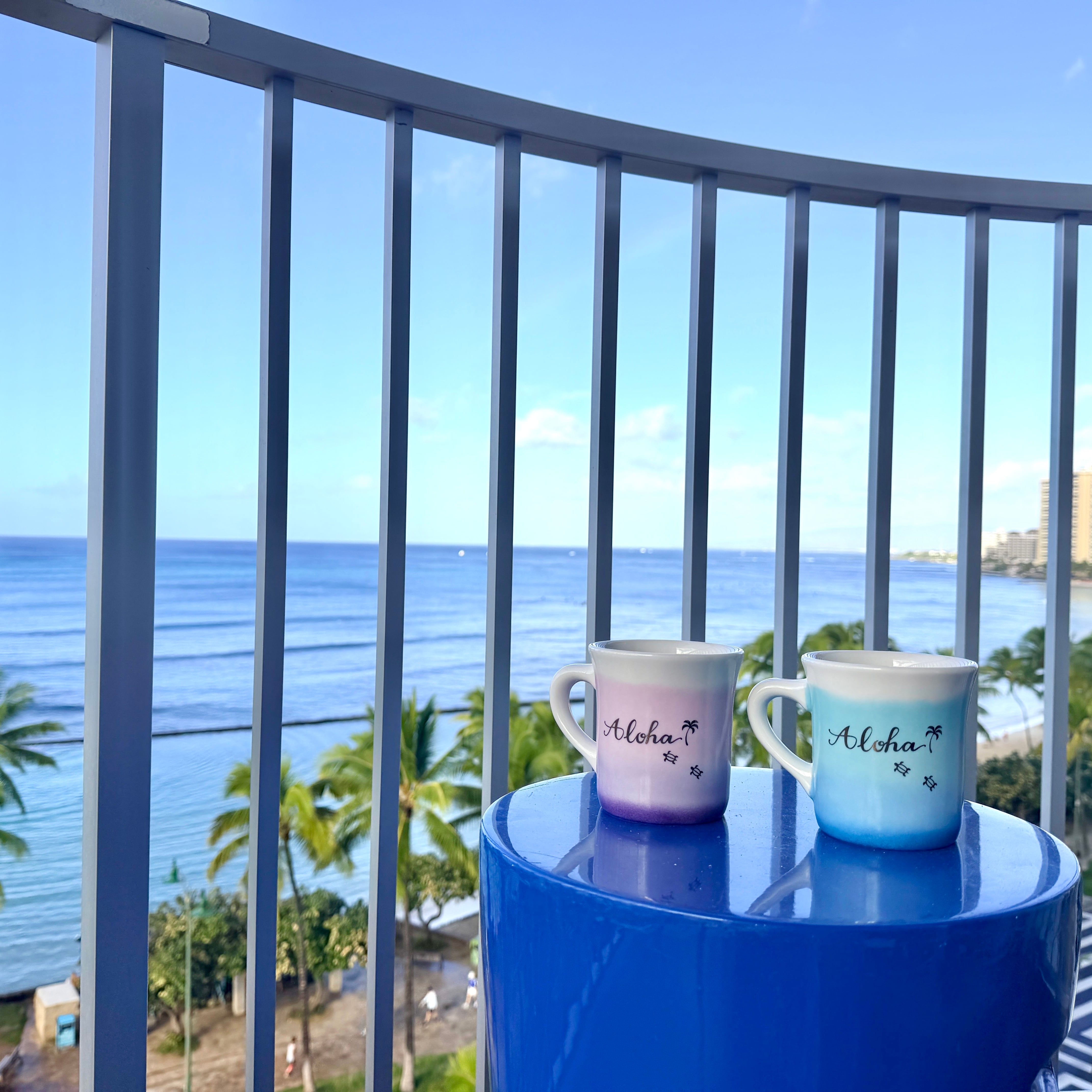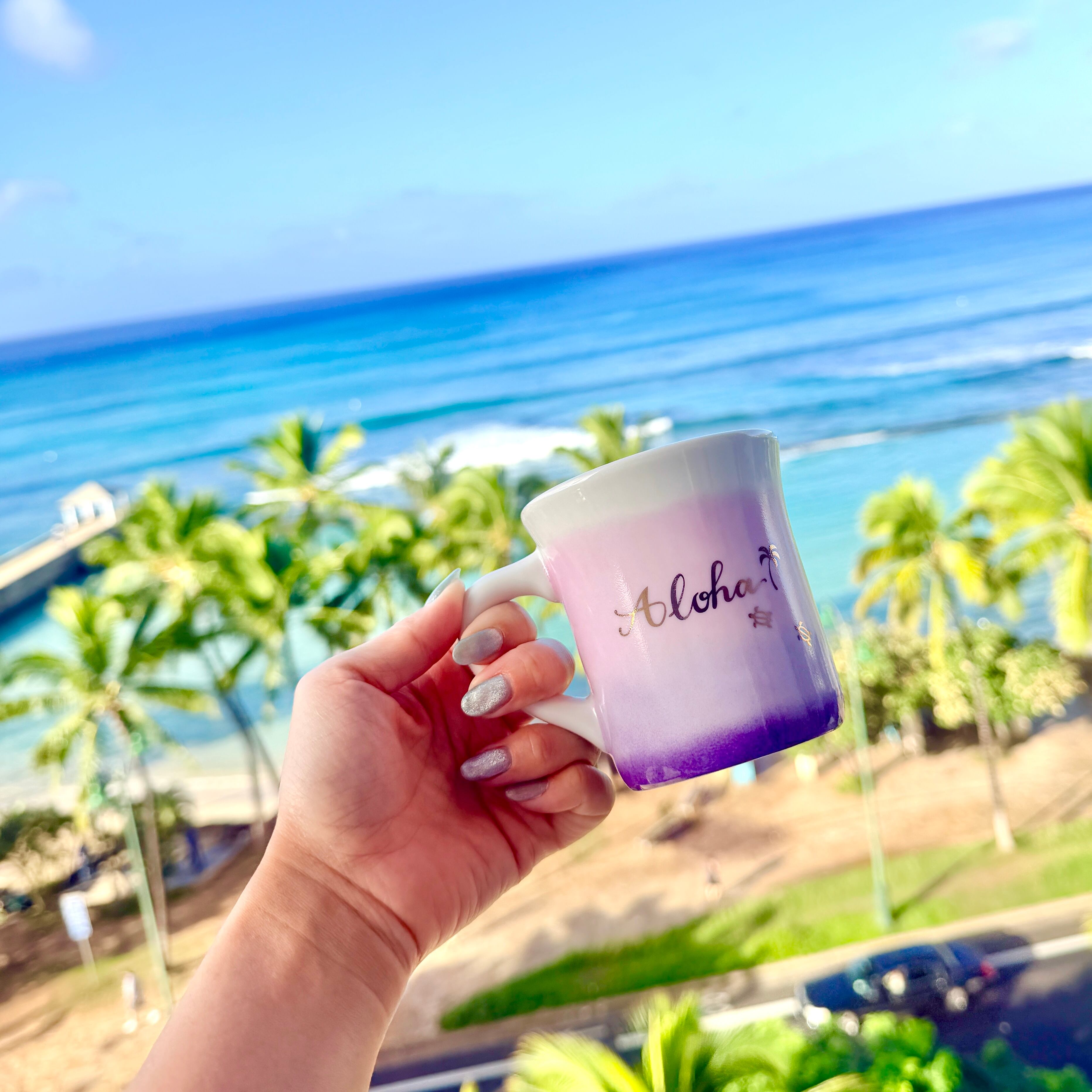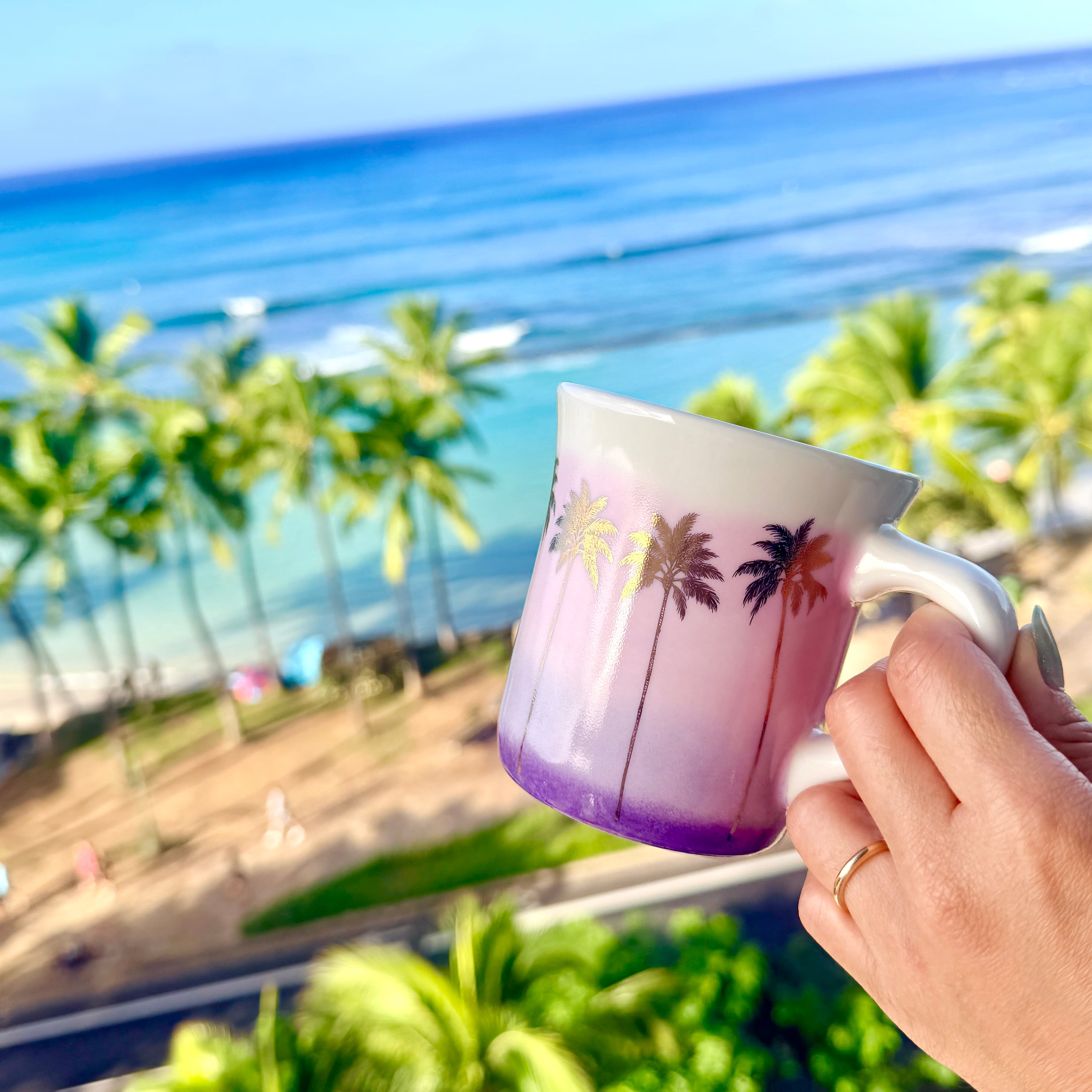 サンセット後の空が焼けるマジックアワー。ピンクからパープルに色づく空のグラデーションを一点一点手作業で色付けし焼き、その後電子レンジ対応ゴールドでヤシの木柄とAlohaを入れて焼いています。