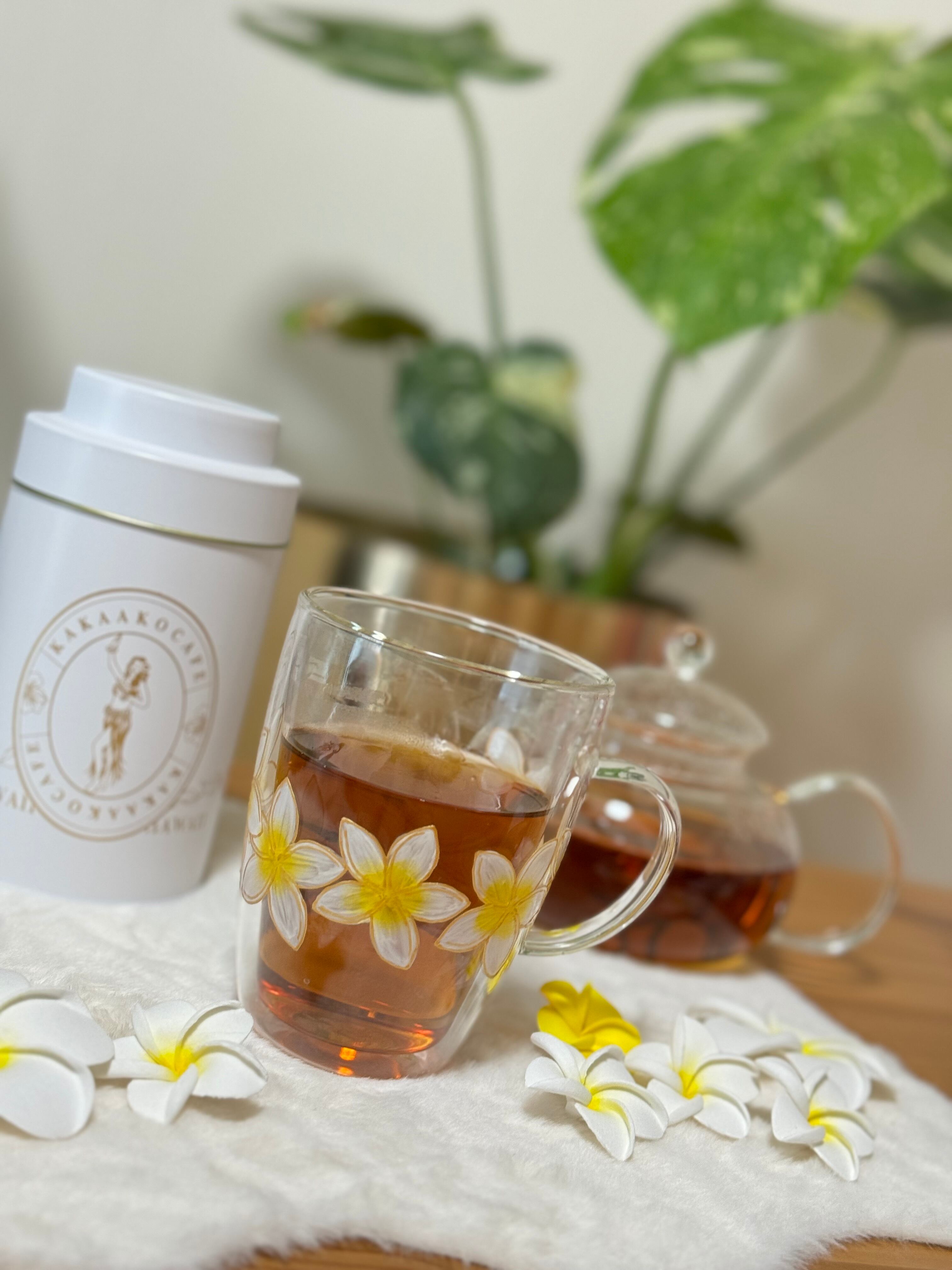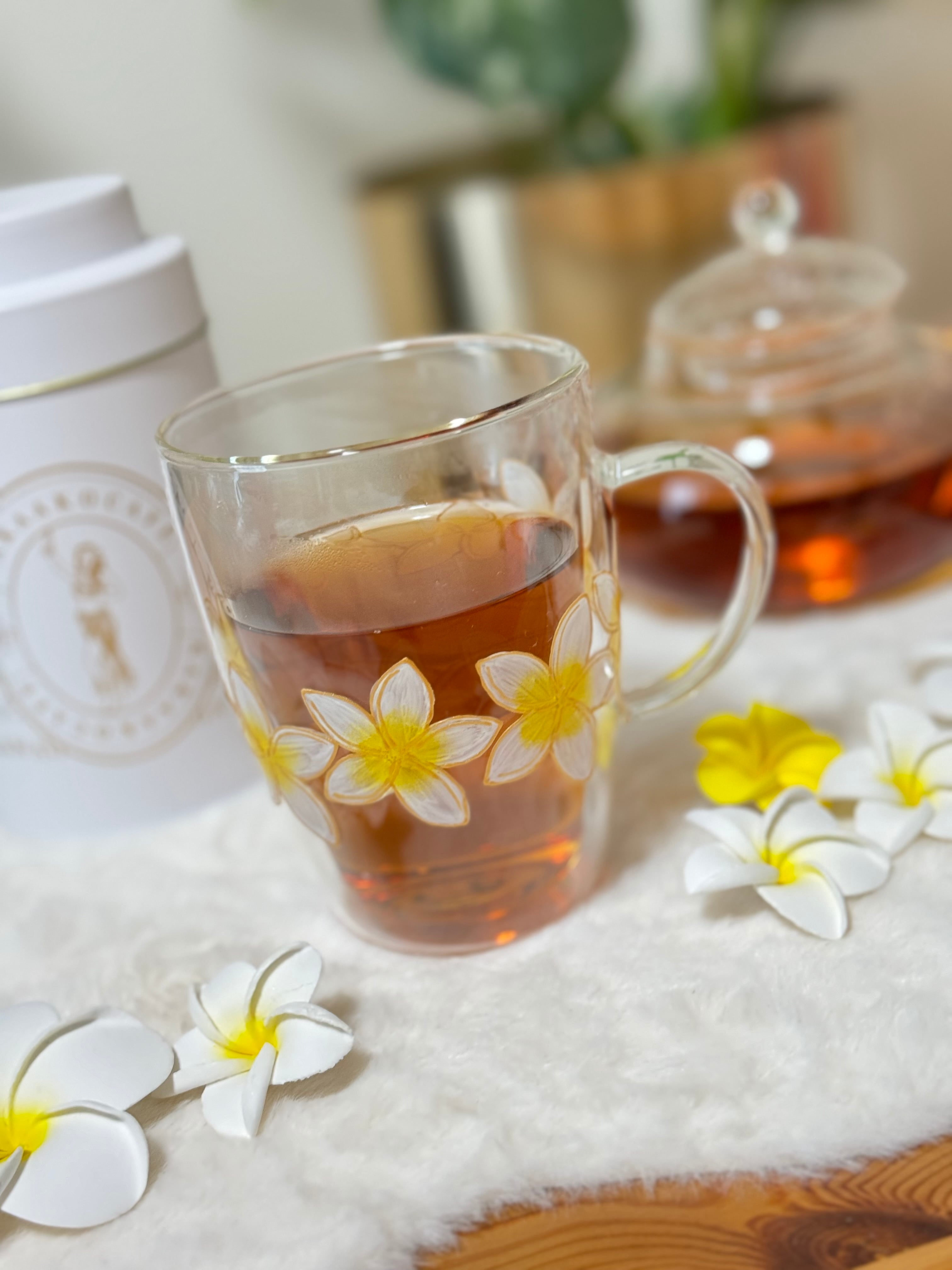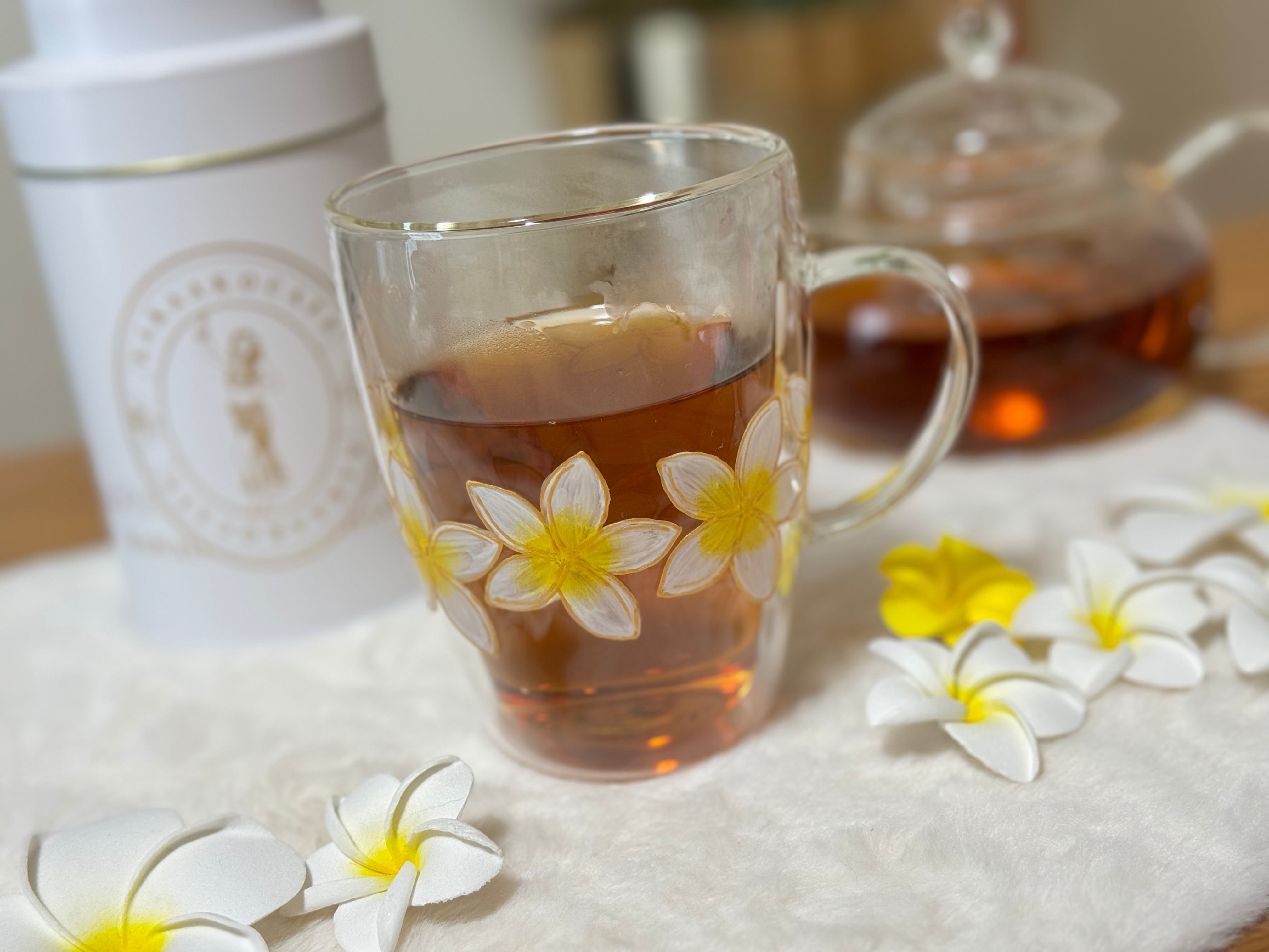 プルメリアの花はハワイでは身に付けると幸せを運ぶとも言われています。この耐熱プルメリアグラスマグを手に持ち、心地よい時間を過ごしてみてください。ほんのひとときの贅沢が、癒しと幸せをもたらしますように。