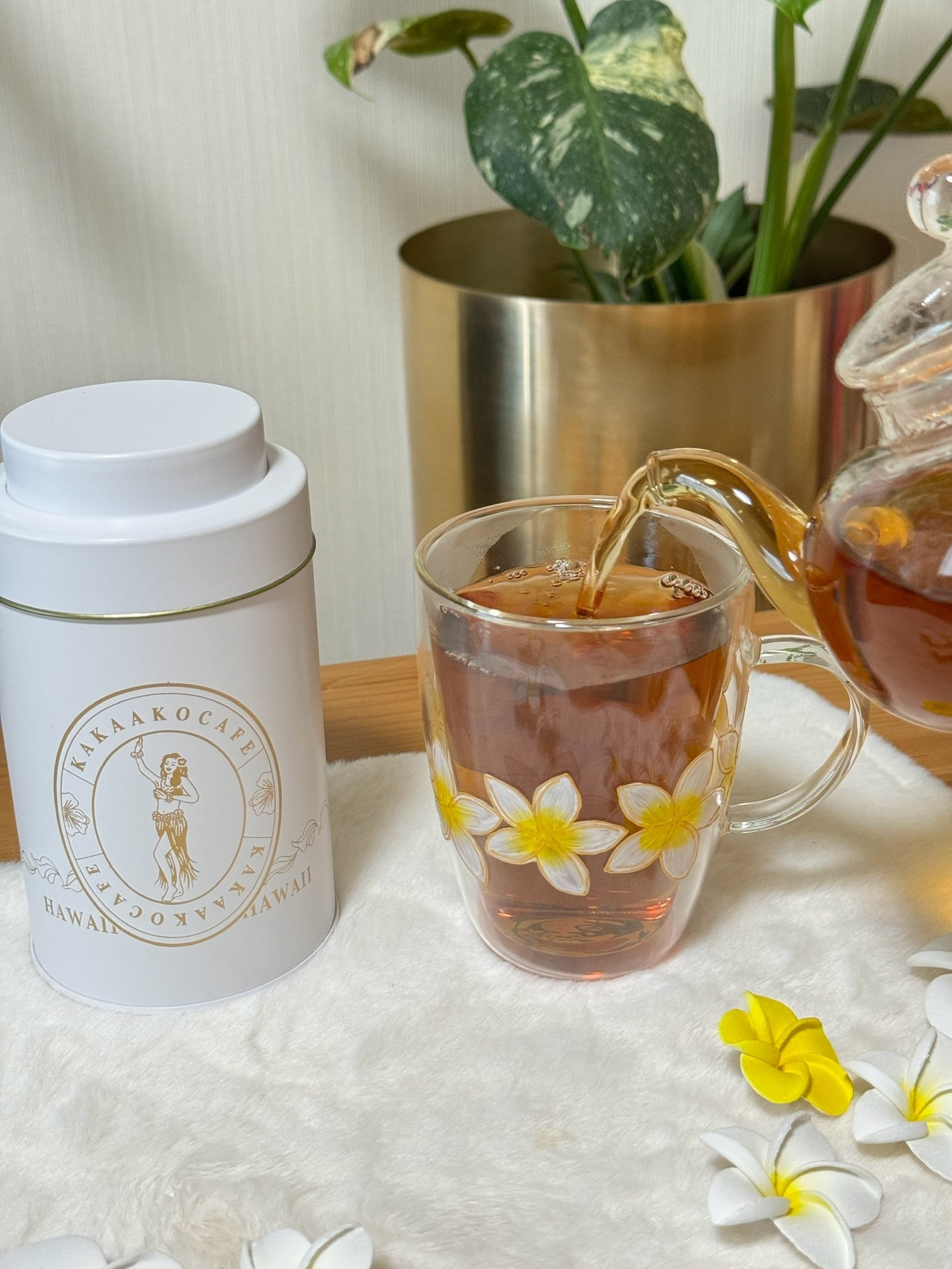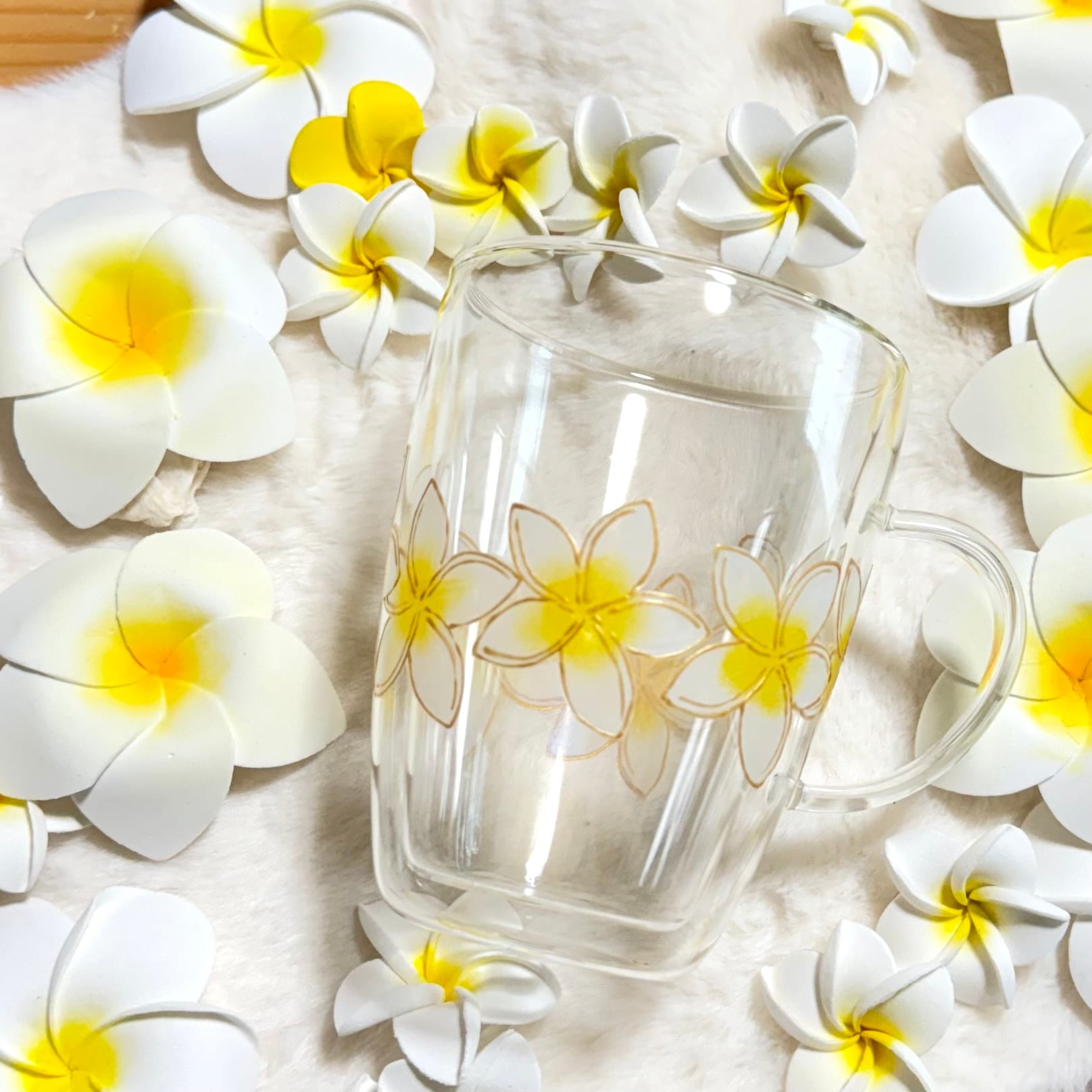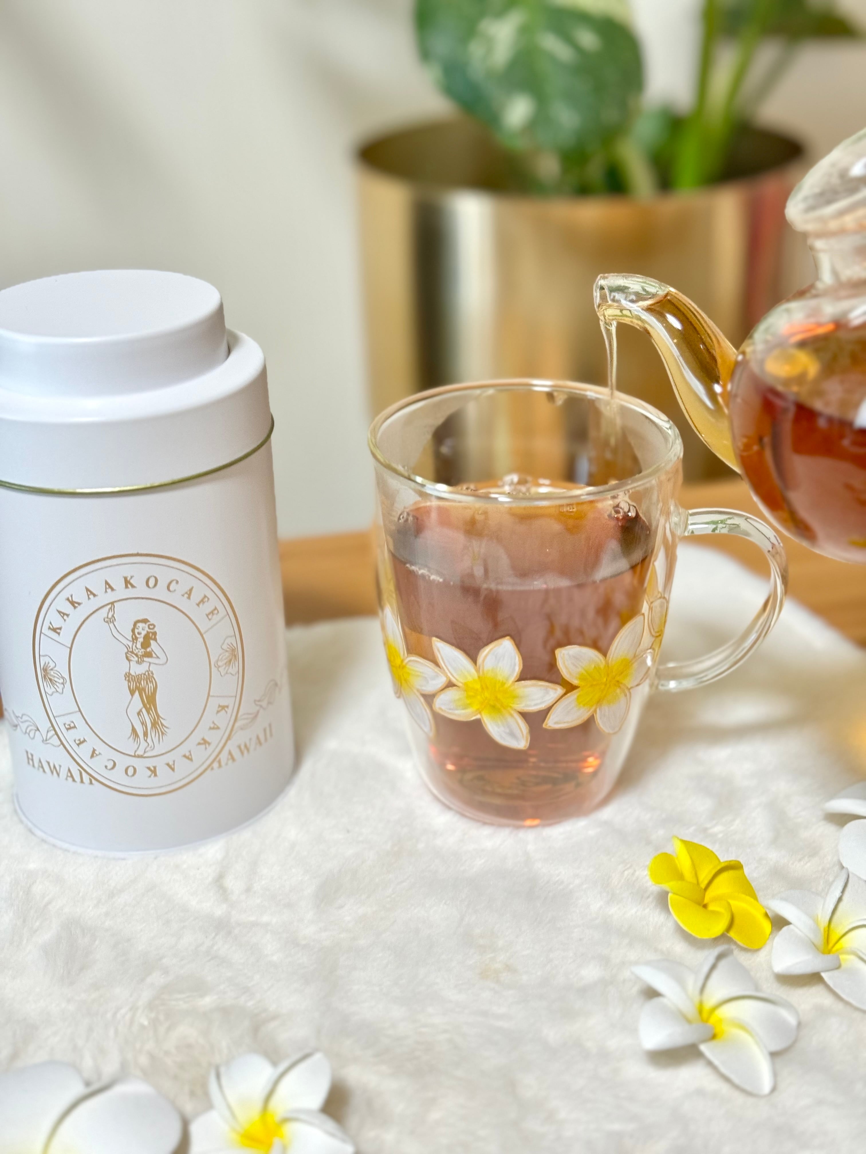 プルメリアの花はハワイでは身に付けると幸せを運ぶとも言われています。この耐熱プルメリアグラスマグを手に持ち、心地よい時間を過ごしてみてください。ほんのひとときの贅沢が、癒しと幸せをもたらしますように。