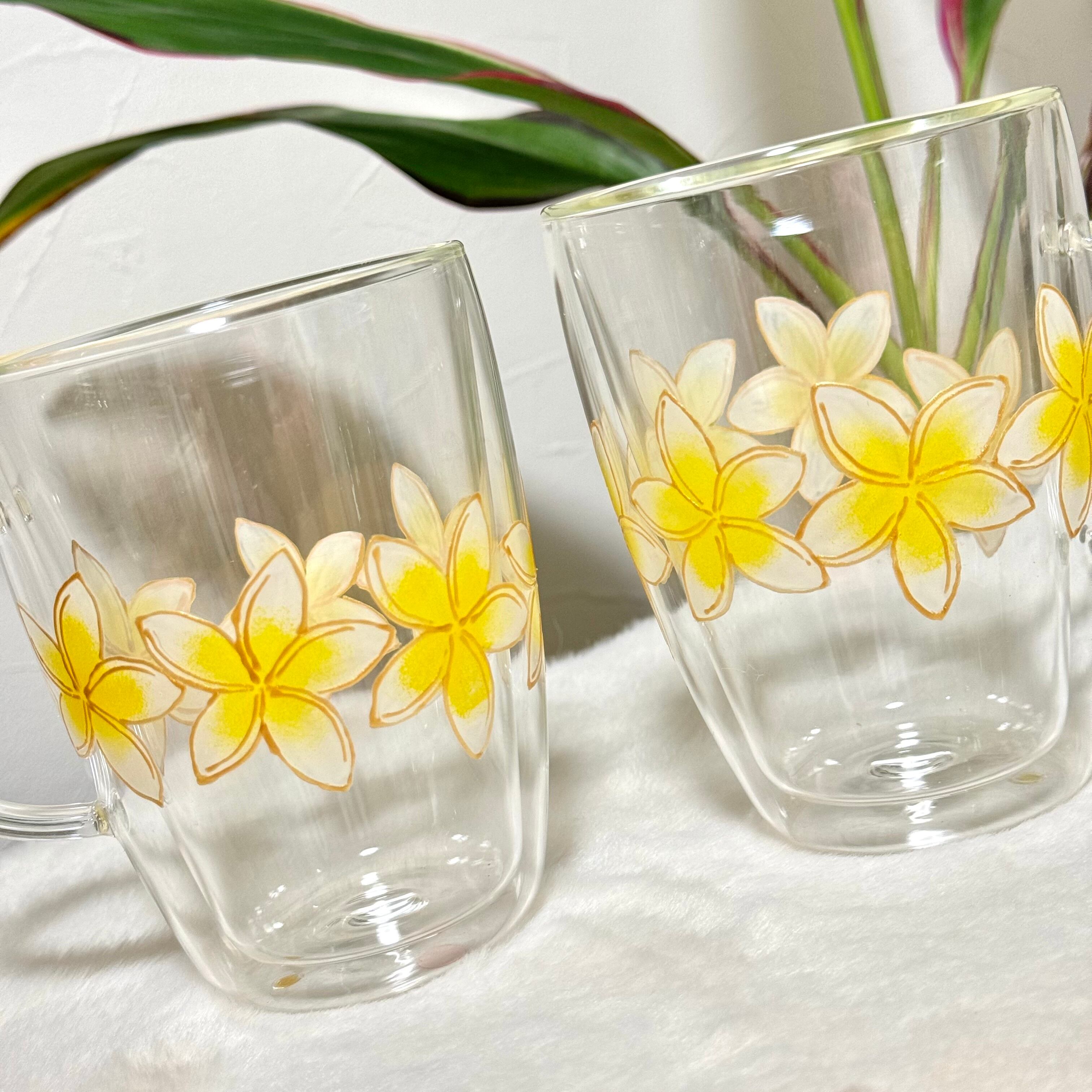 2層になった耐熱グラスに手描きのプルメリア柄がぐるり1周入ったグラスです。