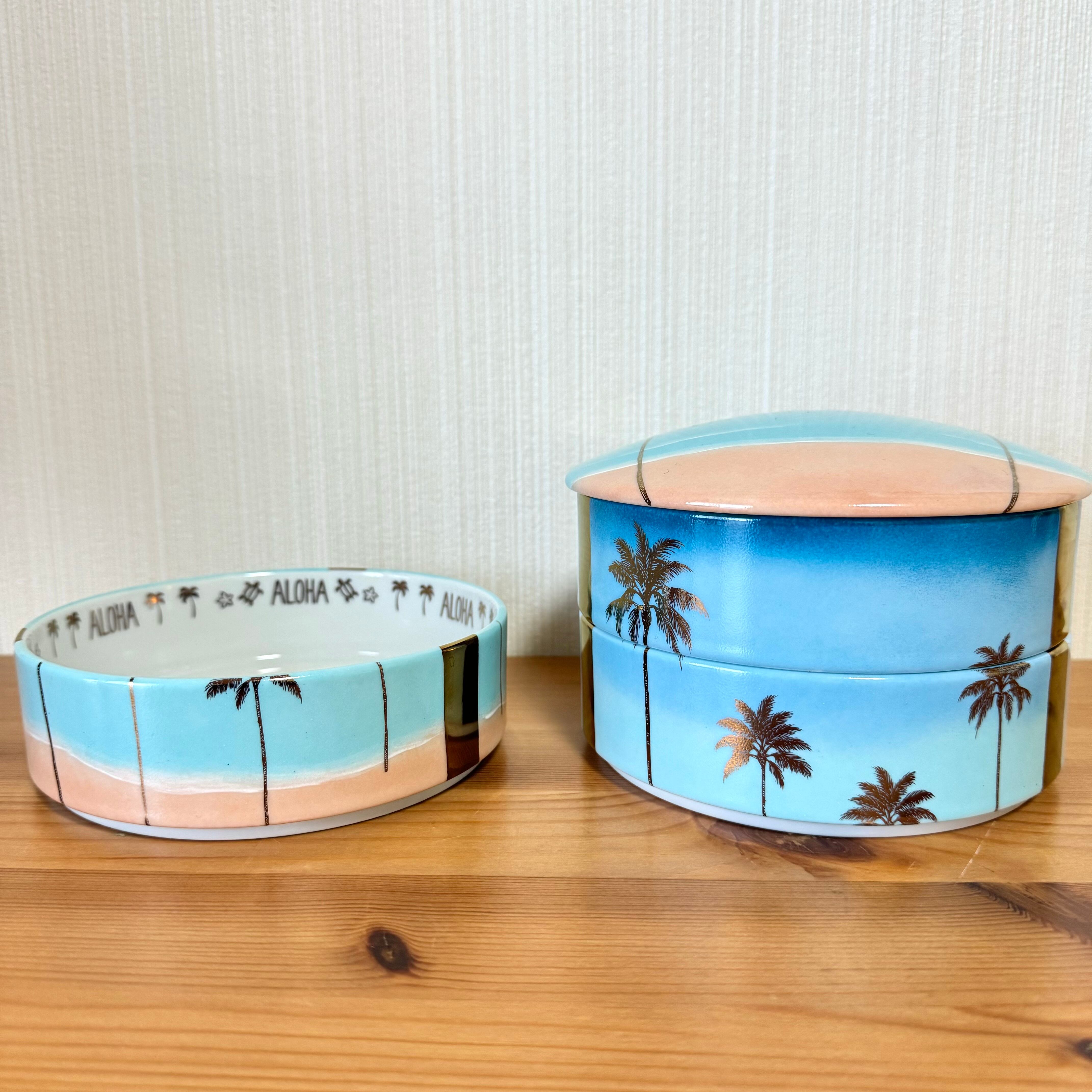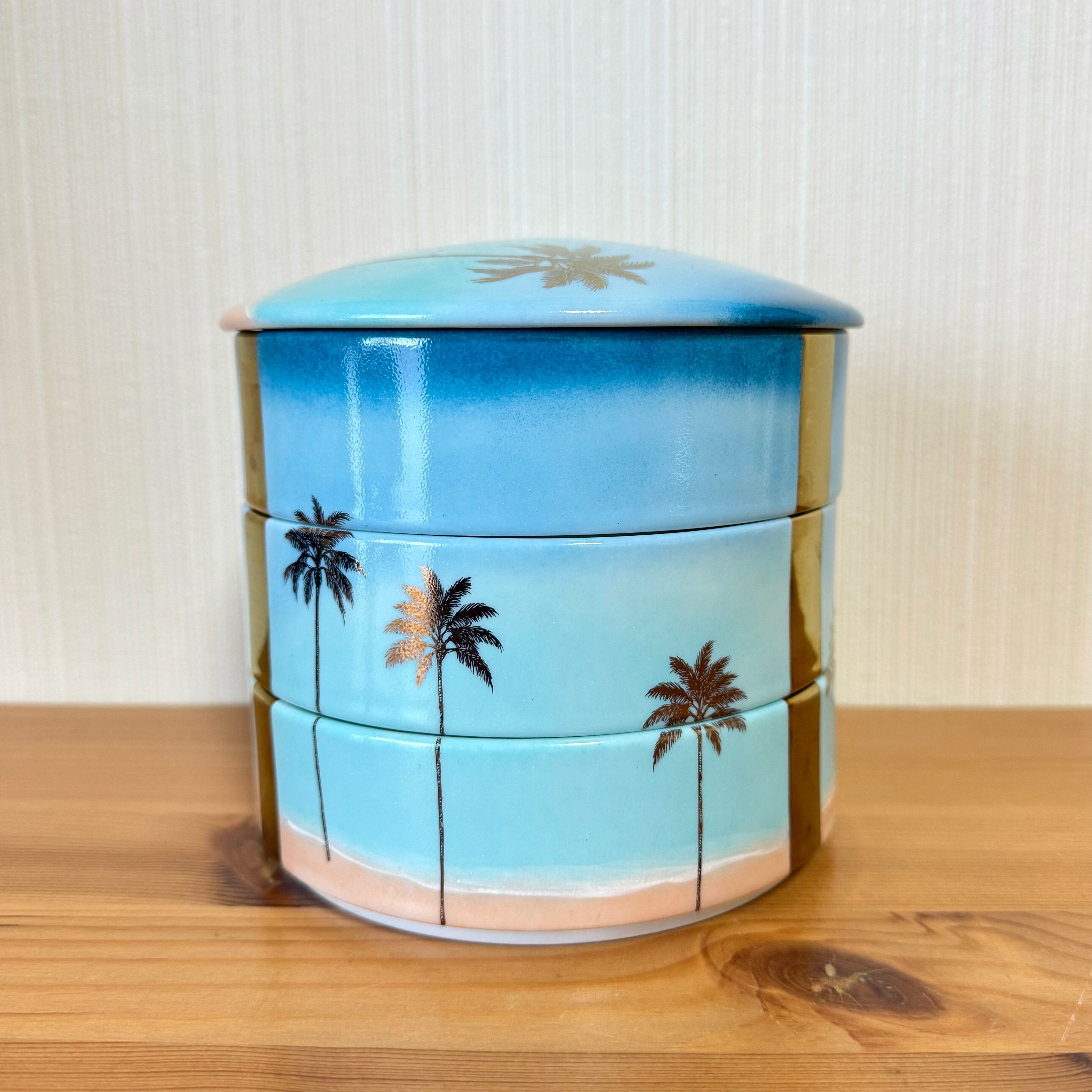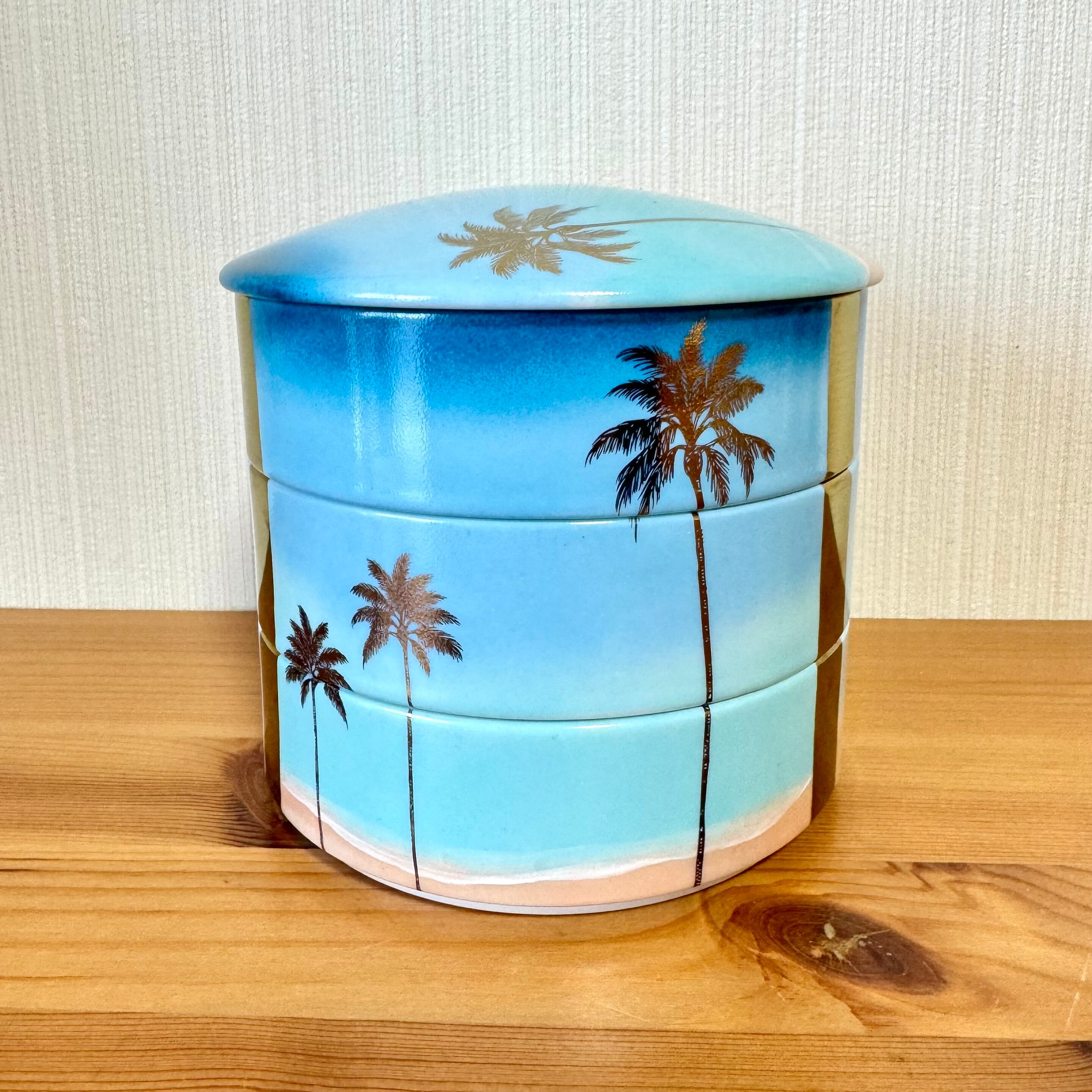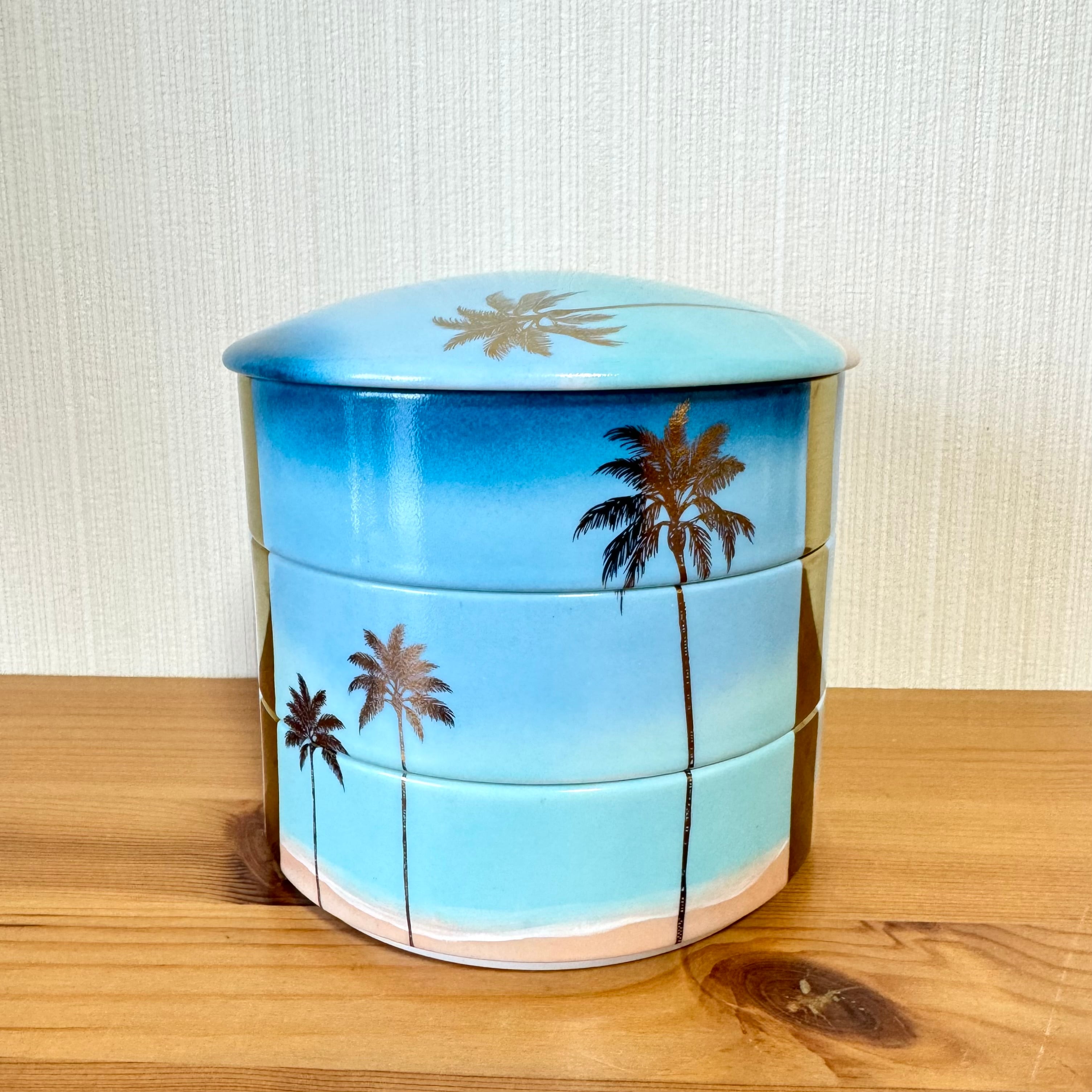 陶器で出来たお重に3回焼成で絵付した1点もののハワイアンお重です。