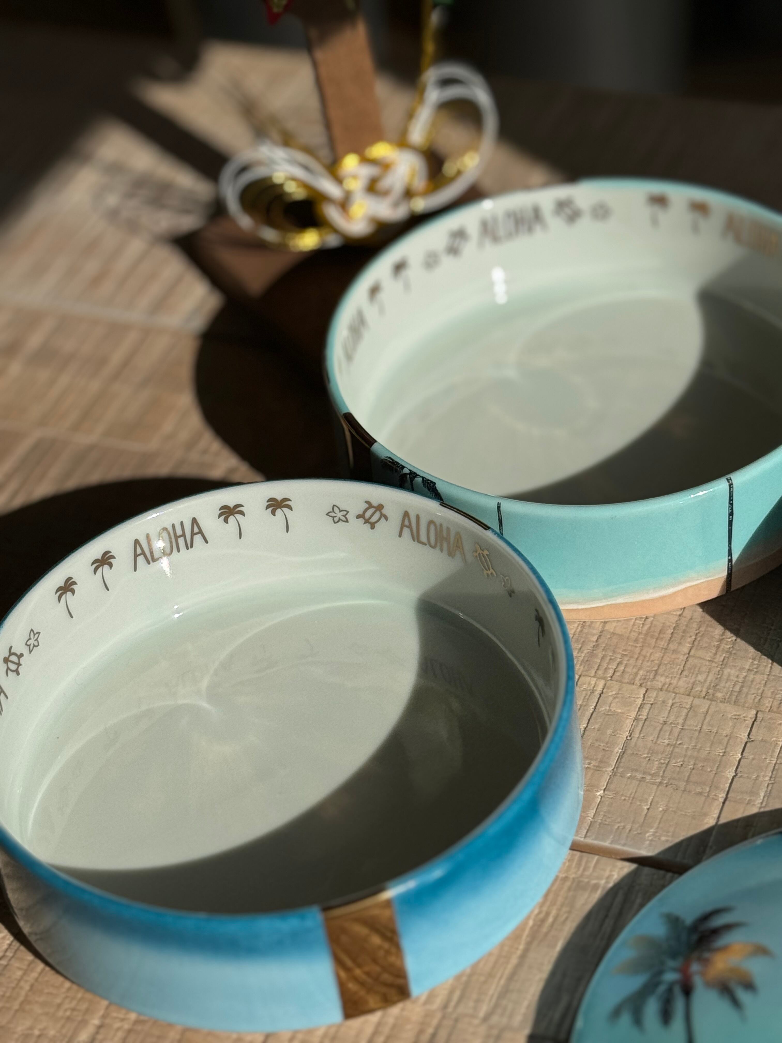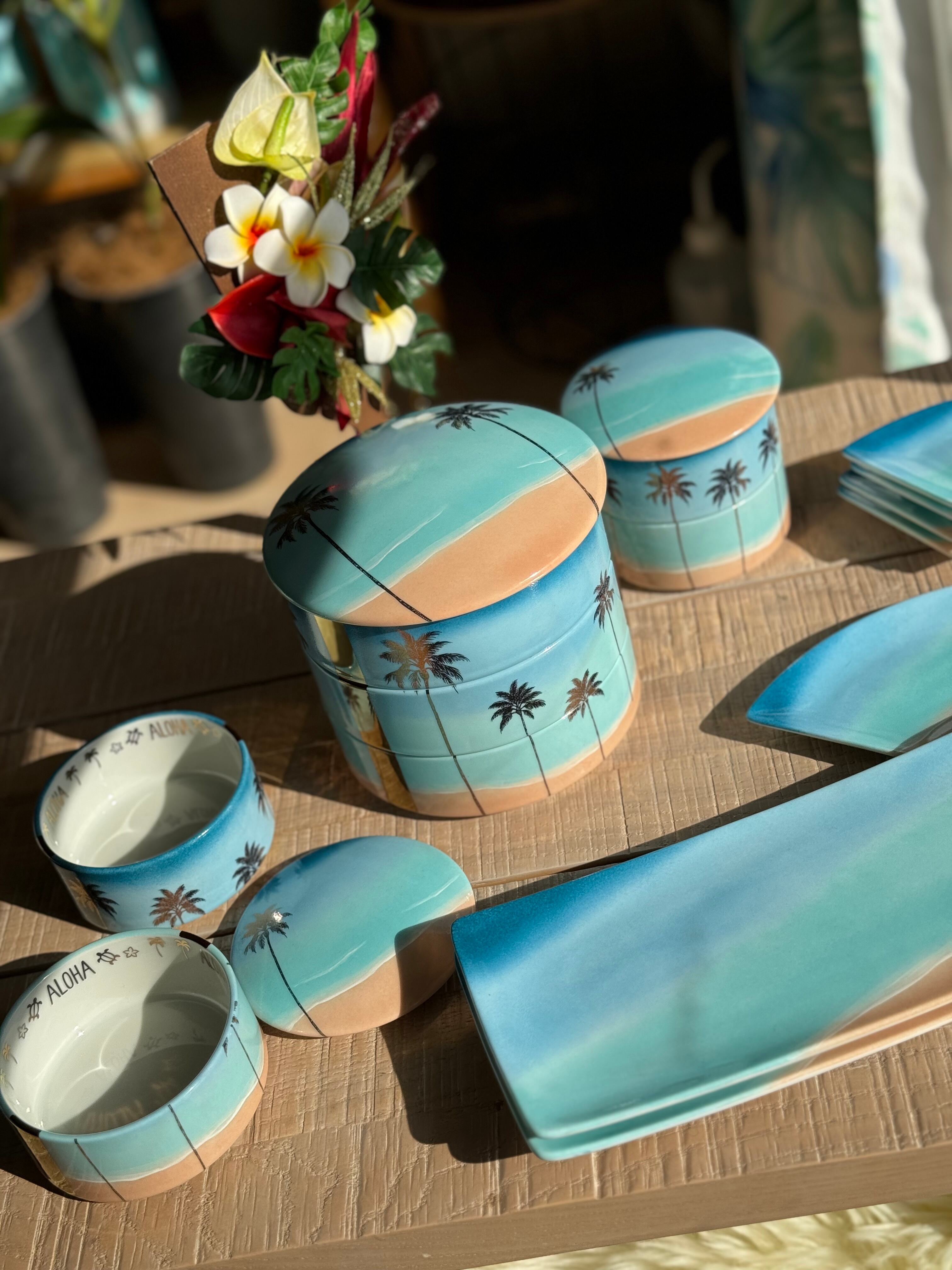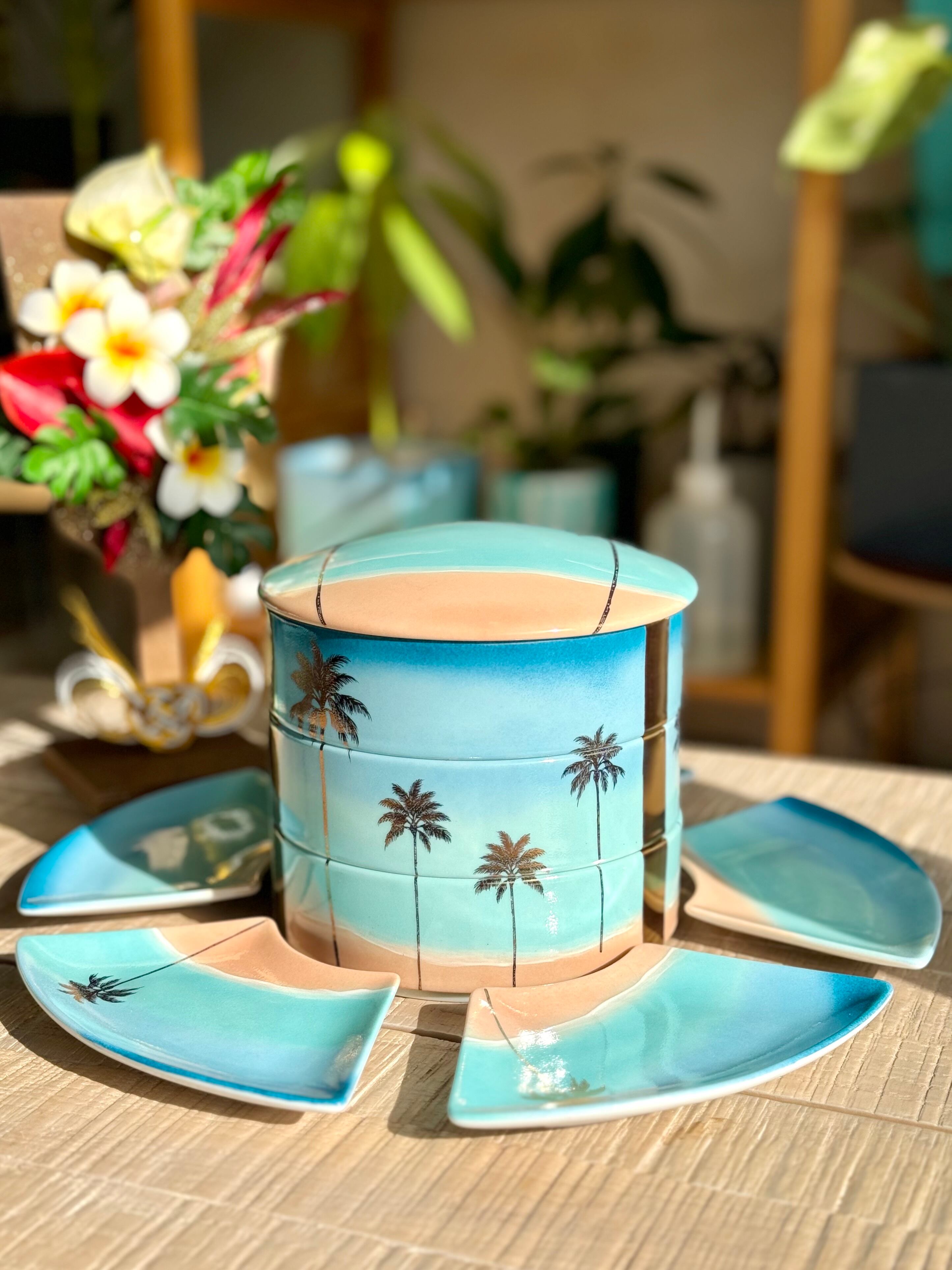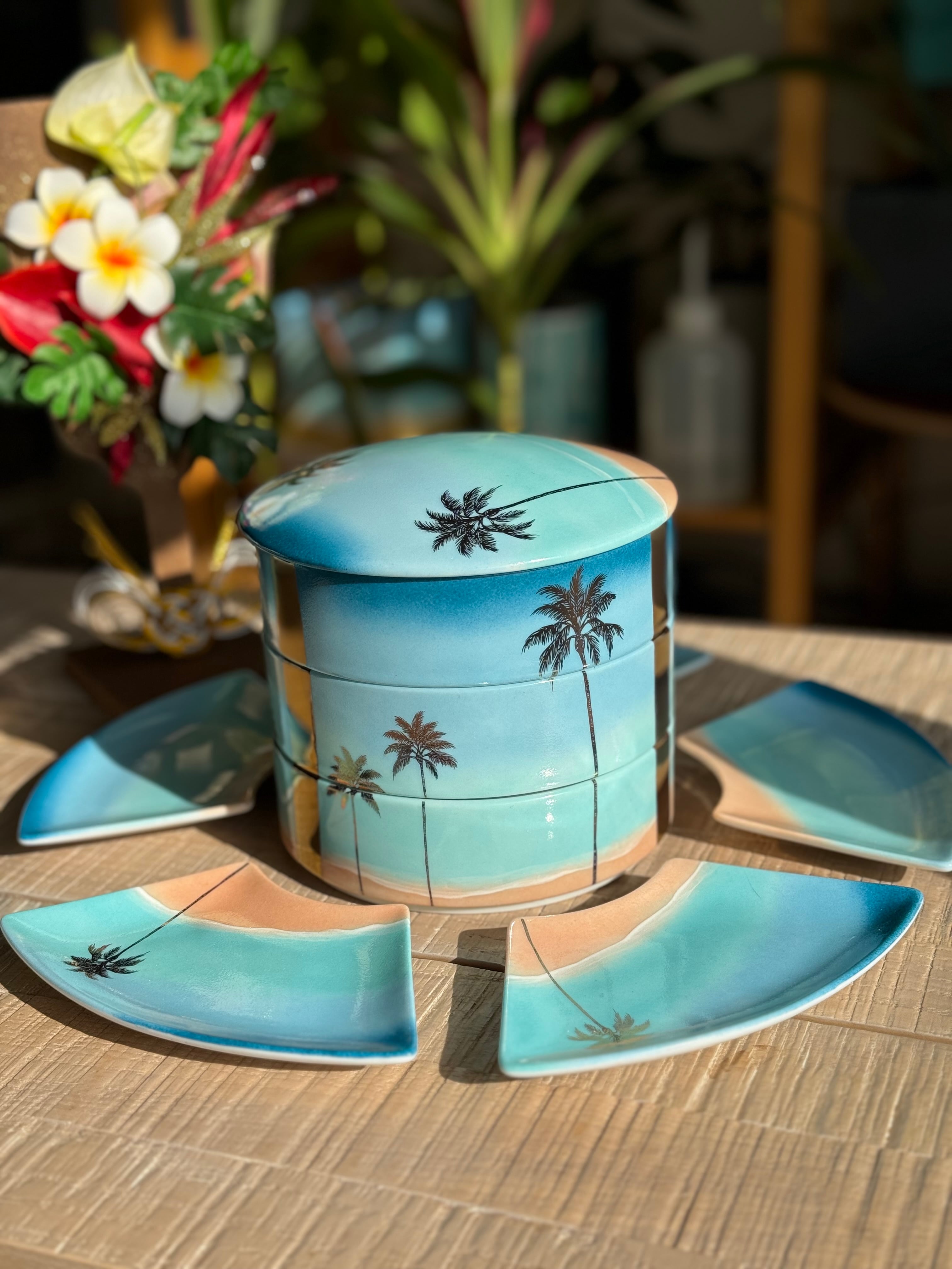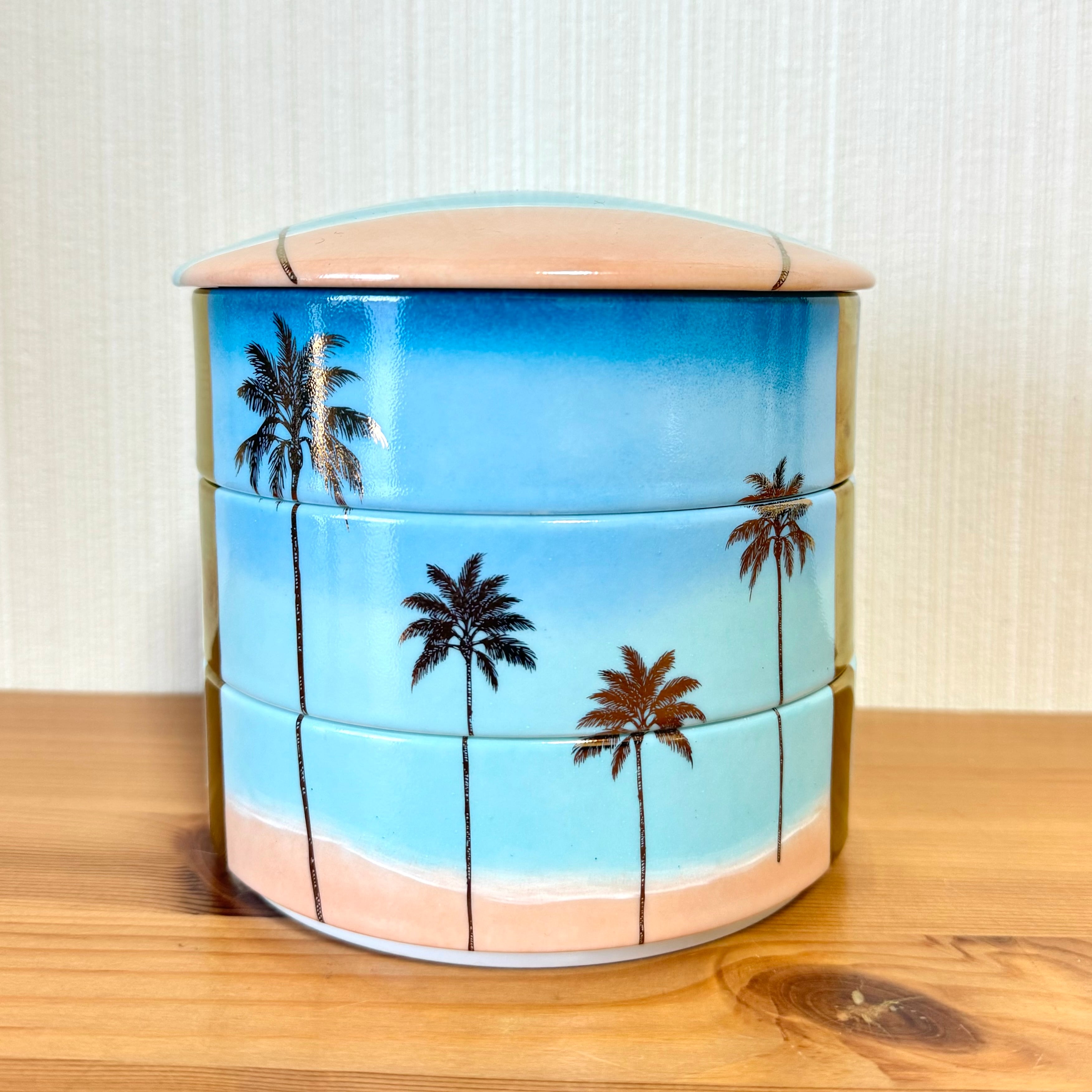 陶器で出来たお重に3回焼成で絵付した1点もののハワイアンお重です。