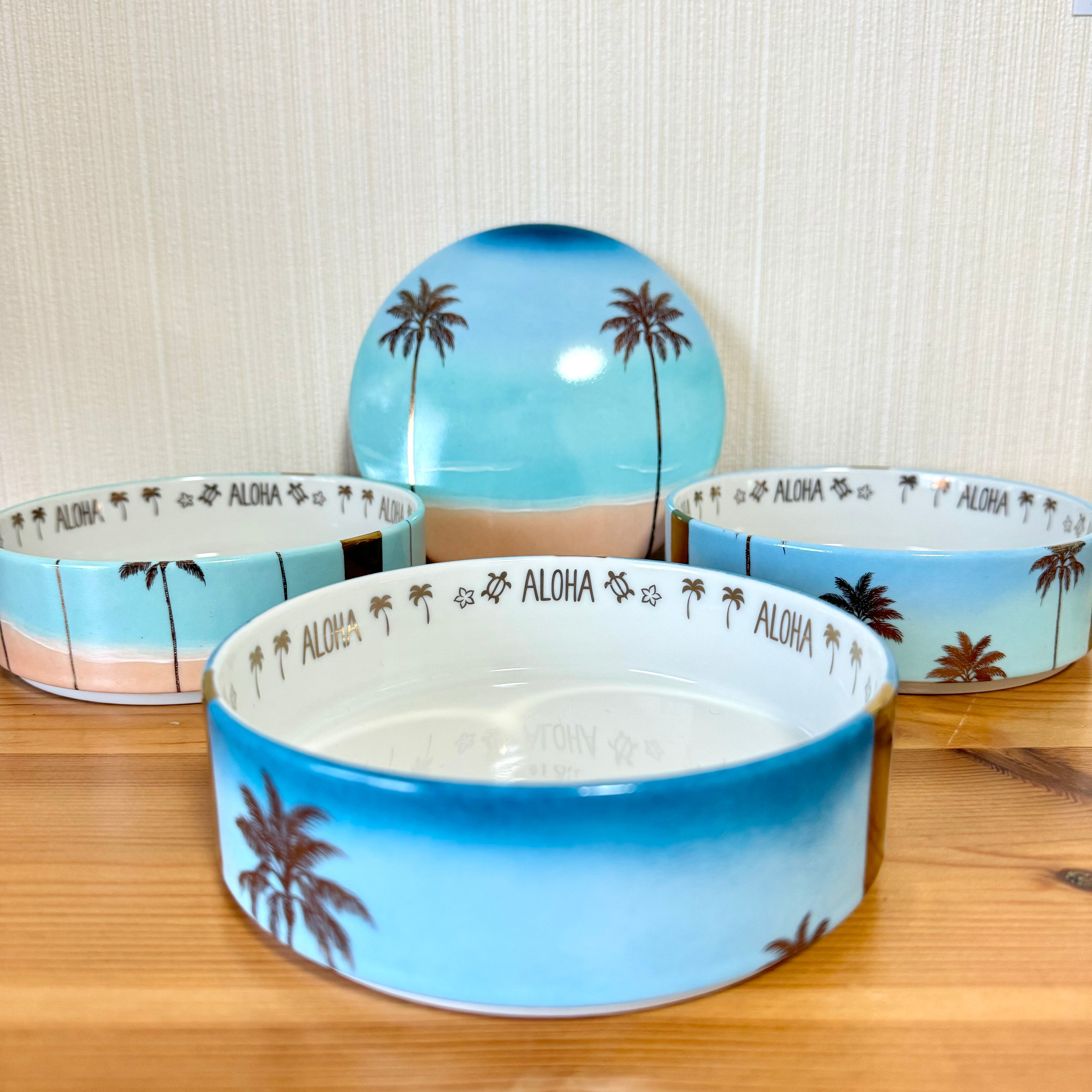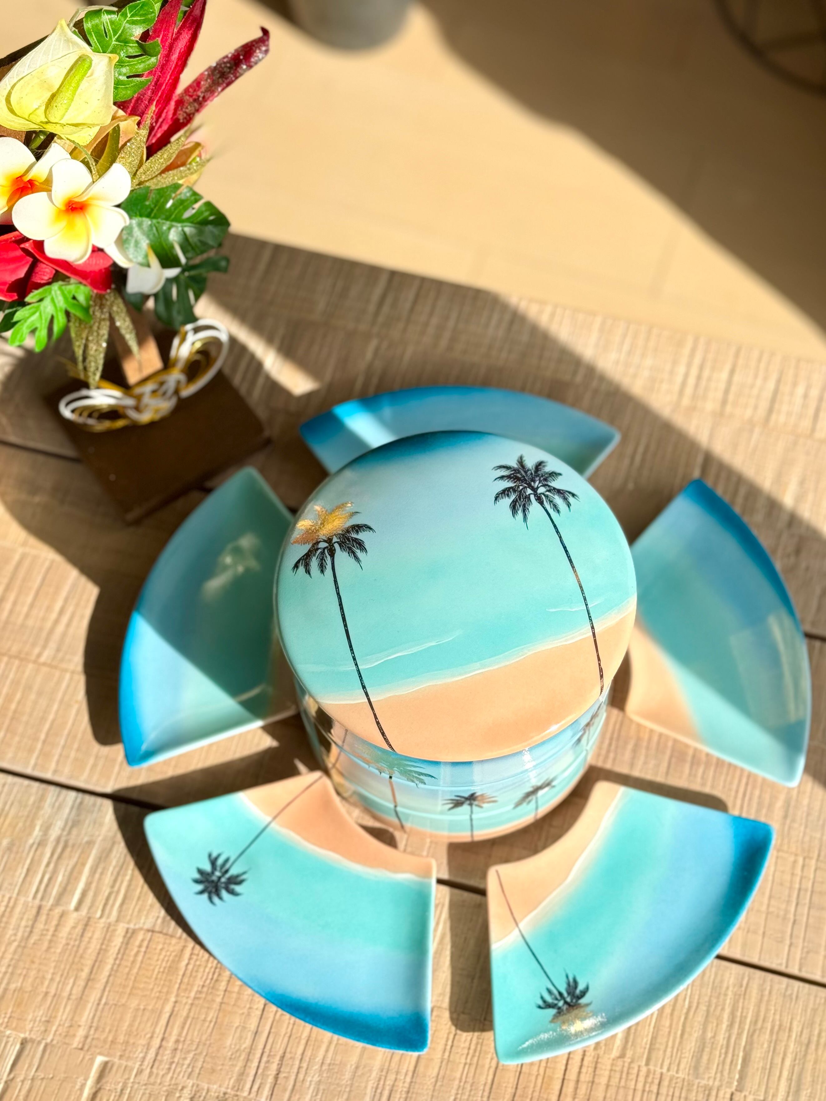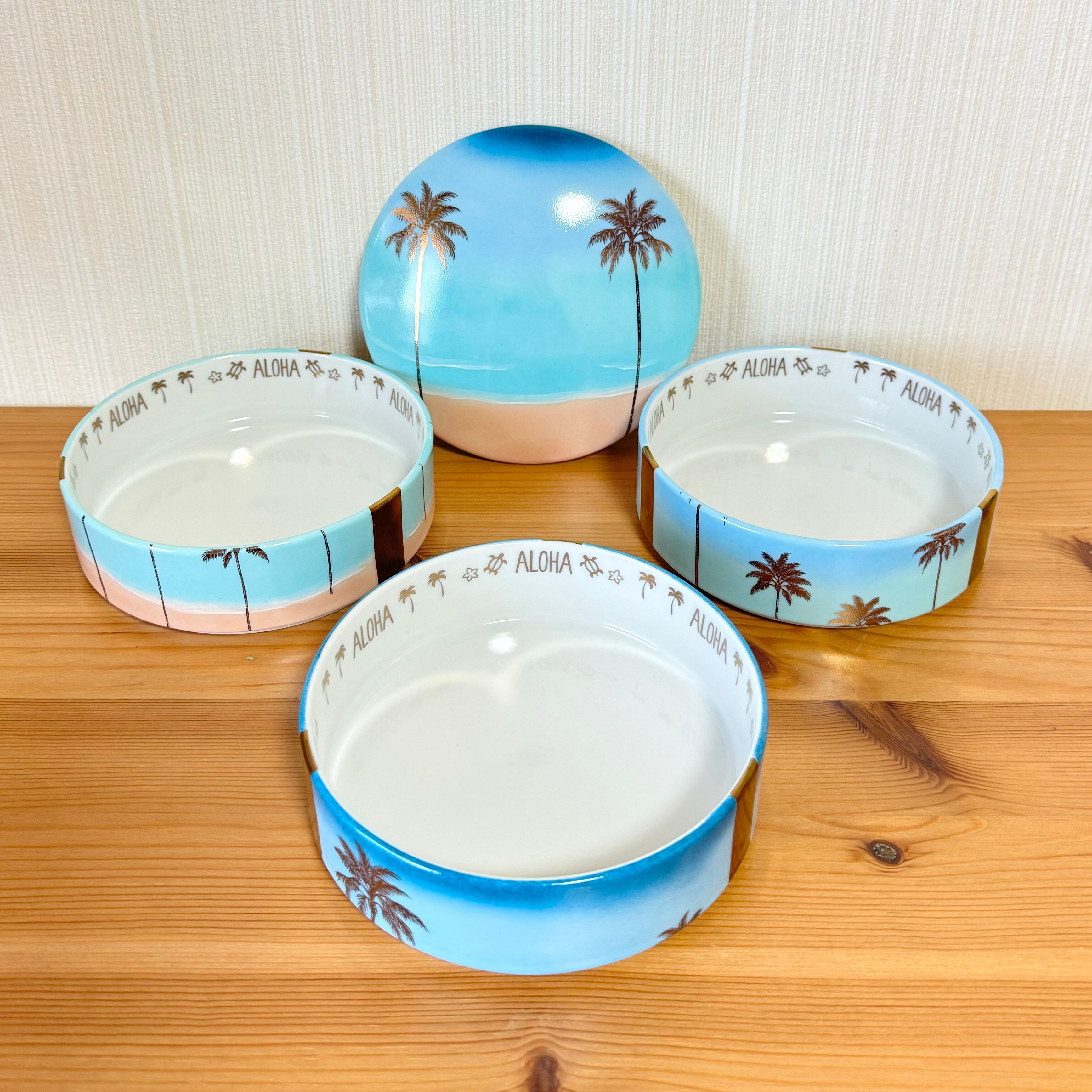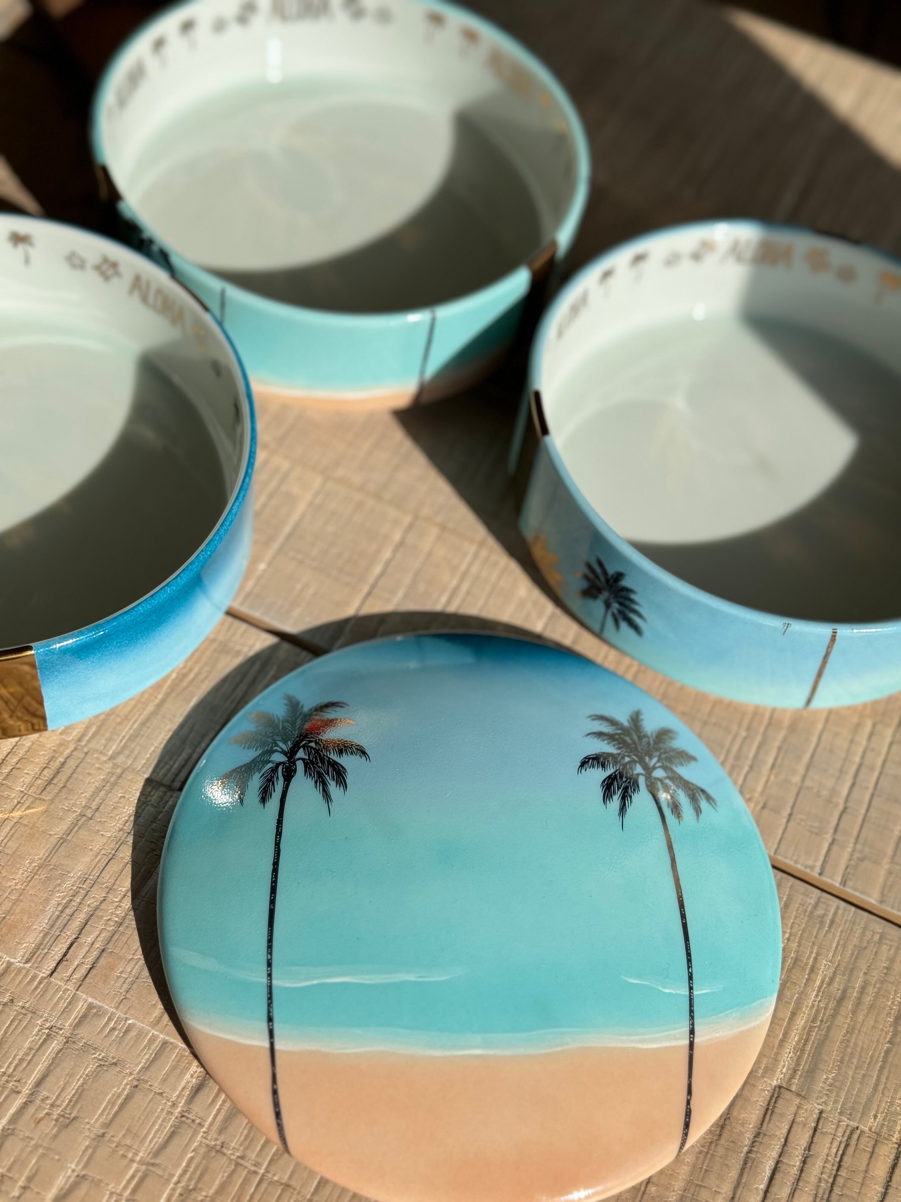 美しい海と砂浜の色付けをして焼いたのち、白波を入れて2回目の詳細をし、更に金彩でヤシの木を入れて3度目の焼成をしています。