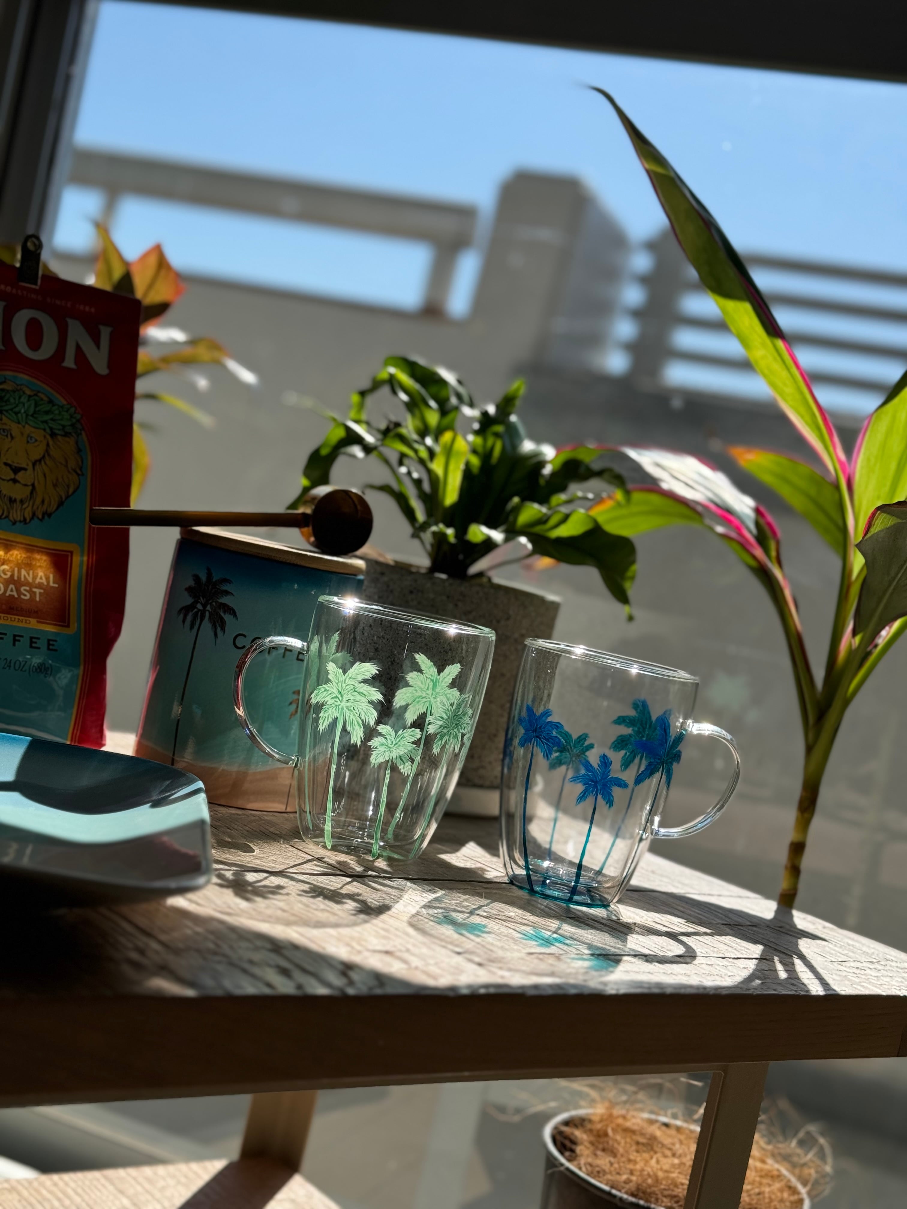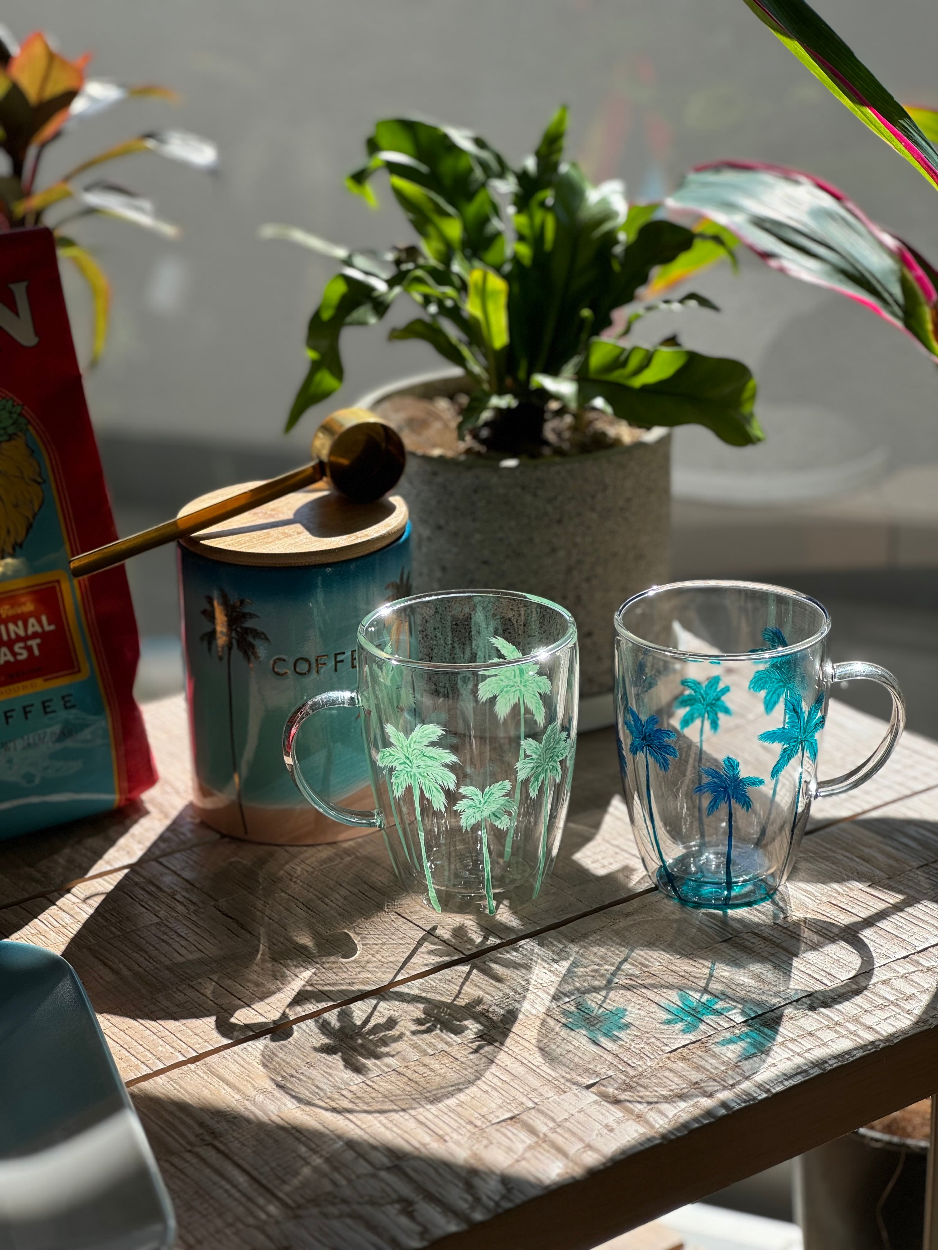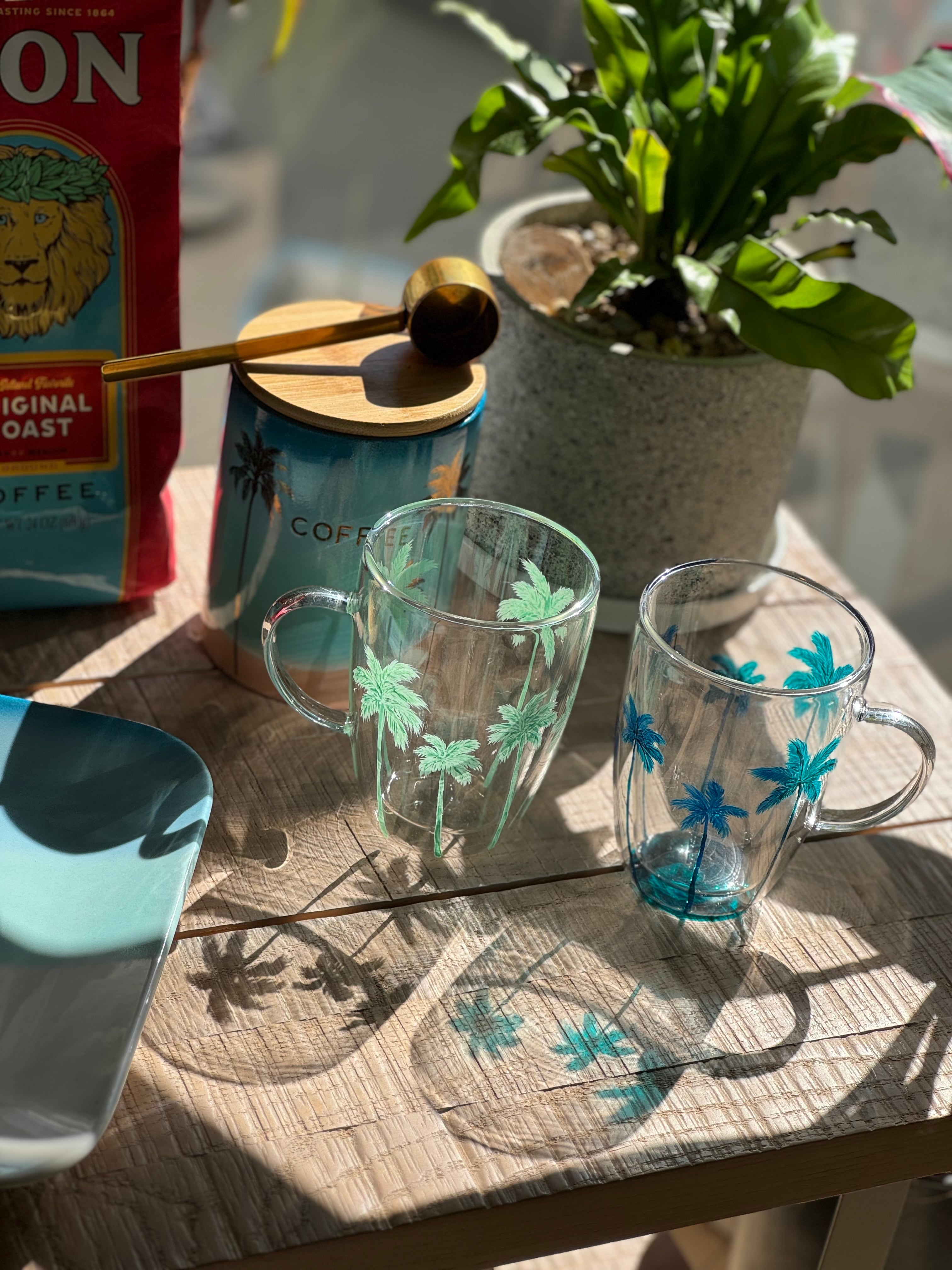 2層になった耐熱グラスに手描きのヤシの木柄がぐるり1周入ったグラスです。