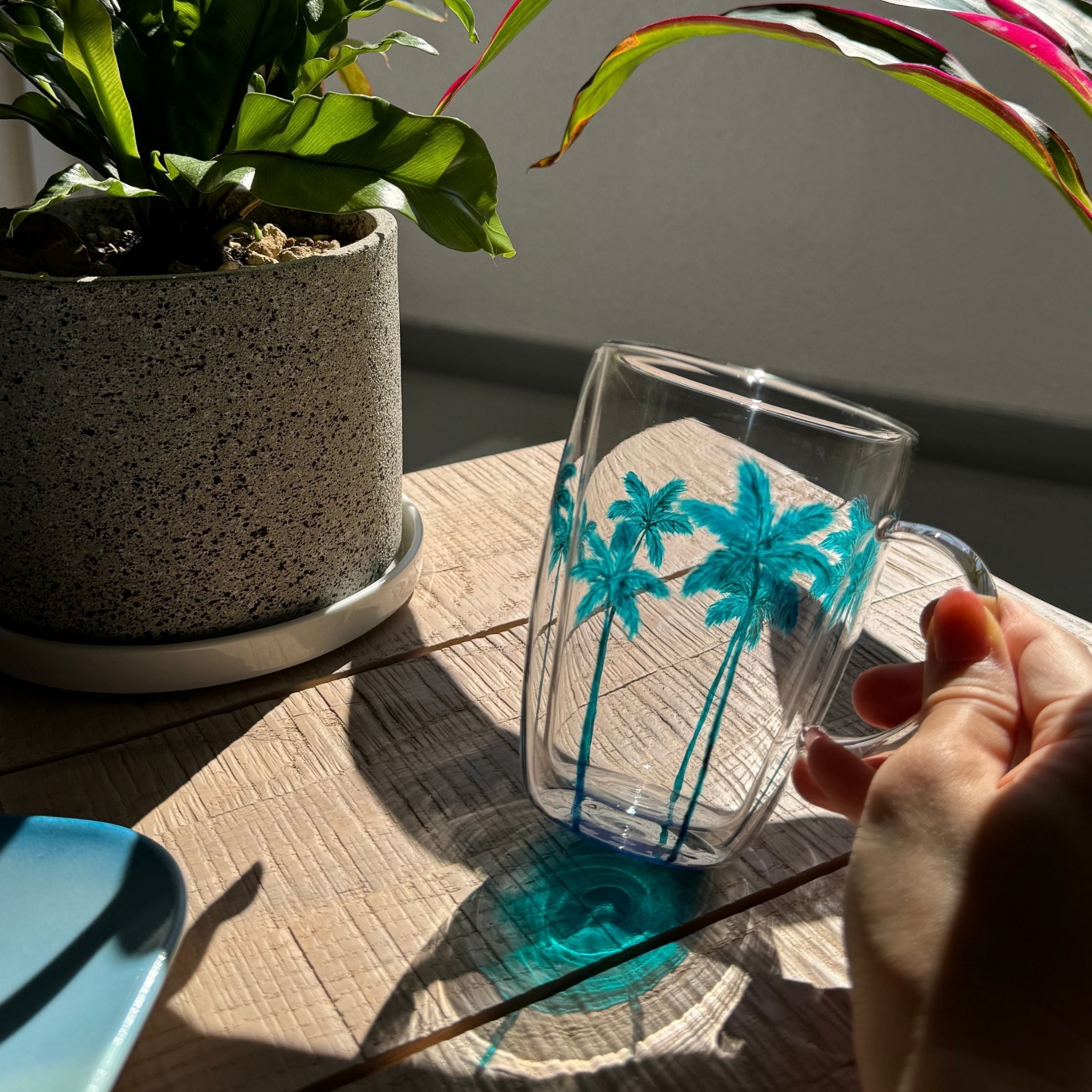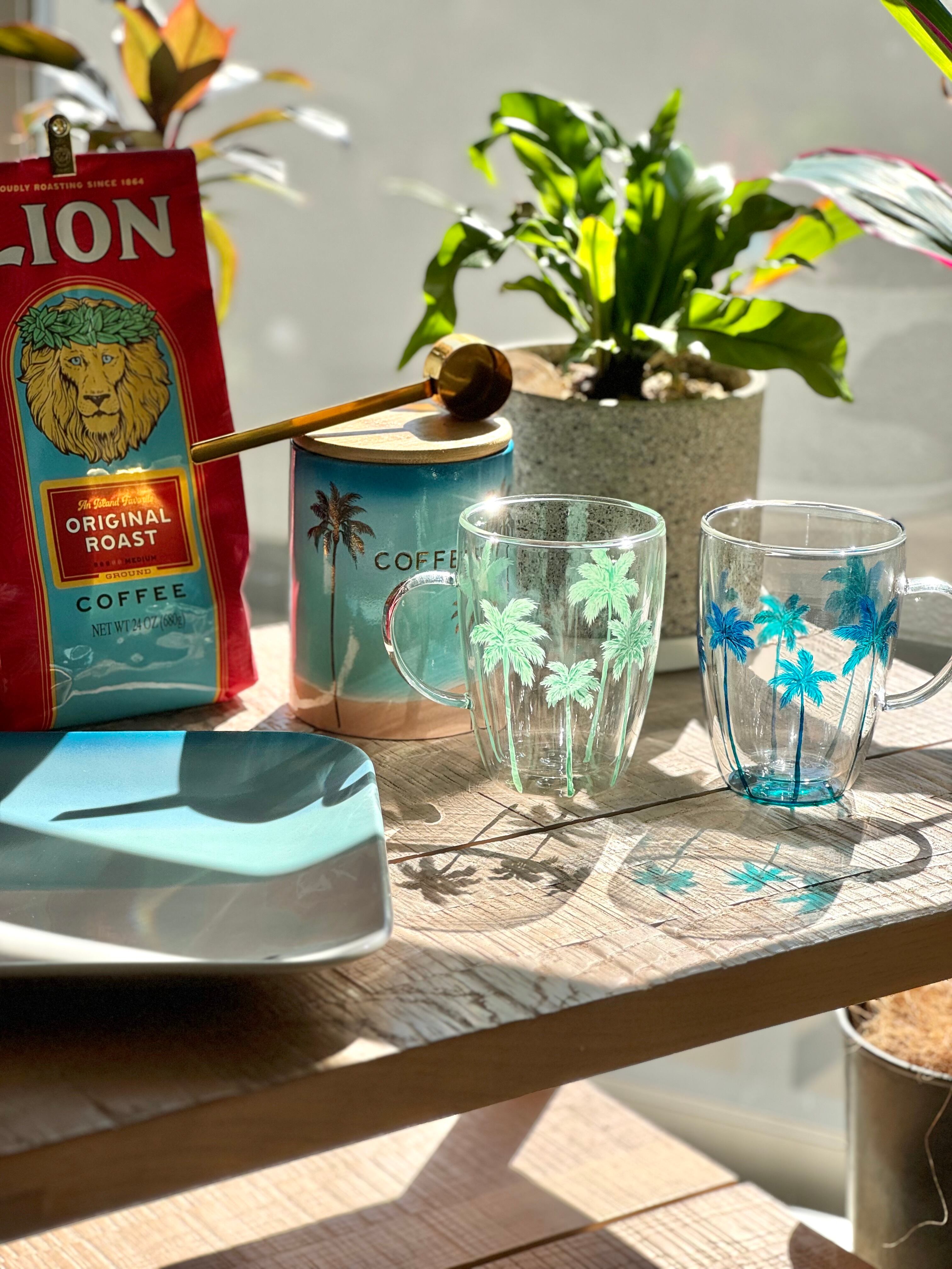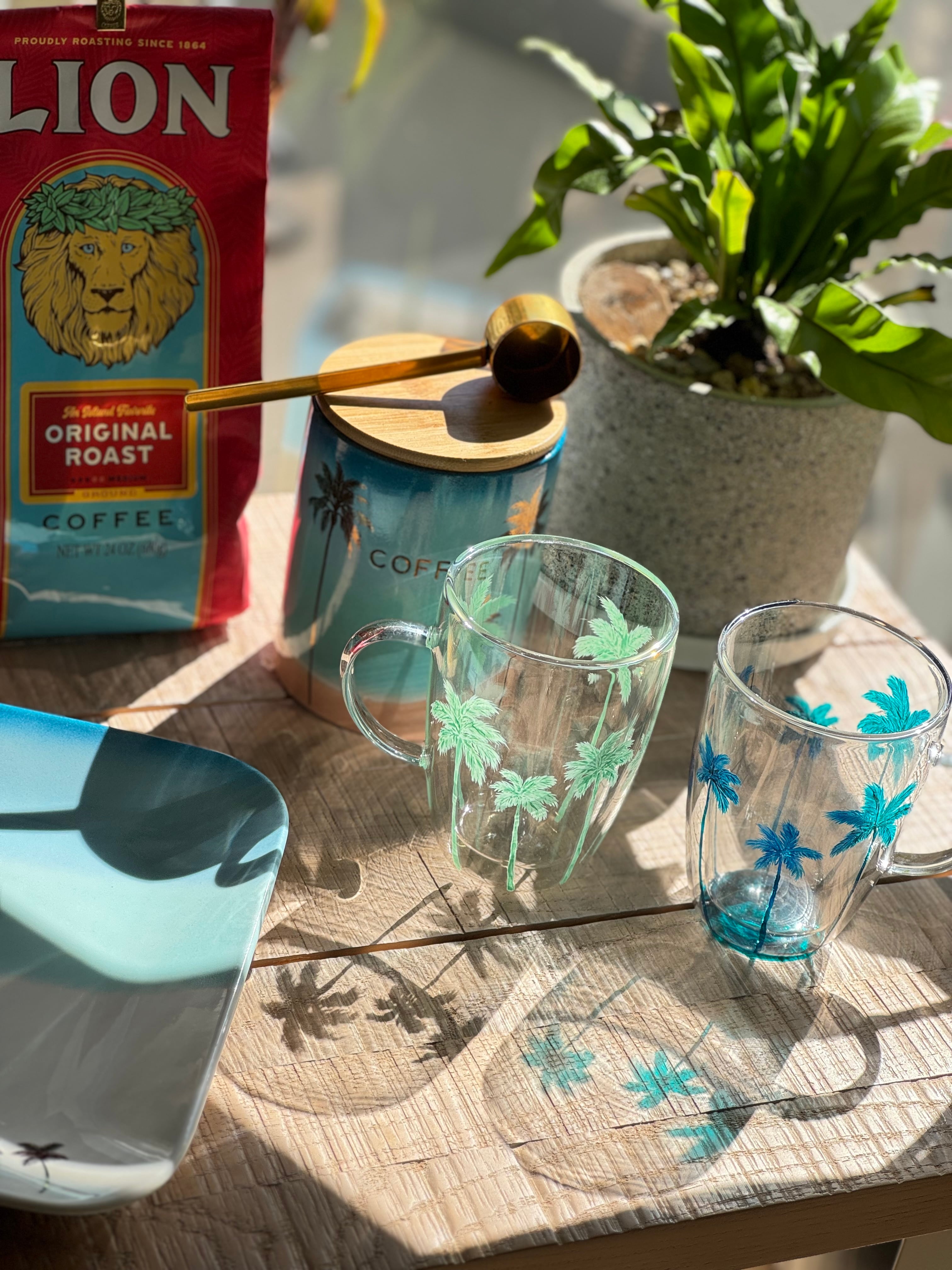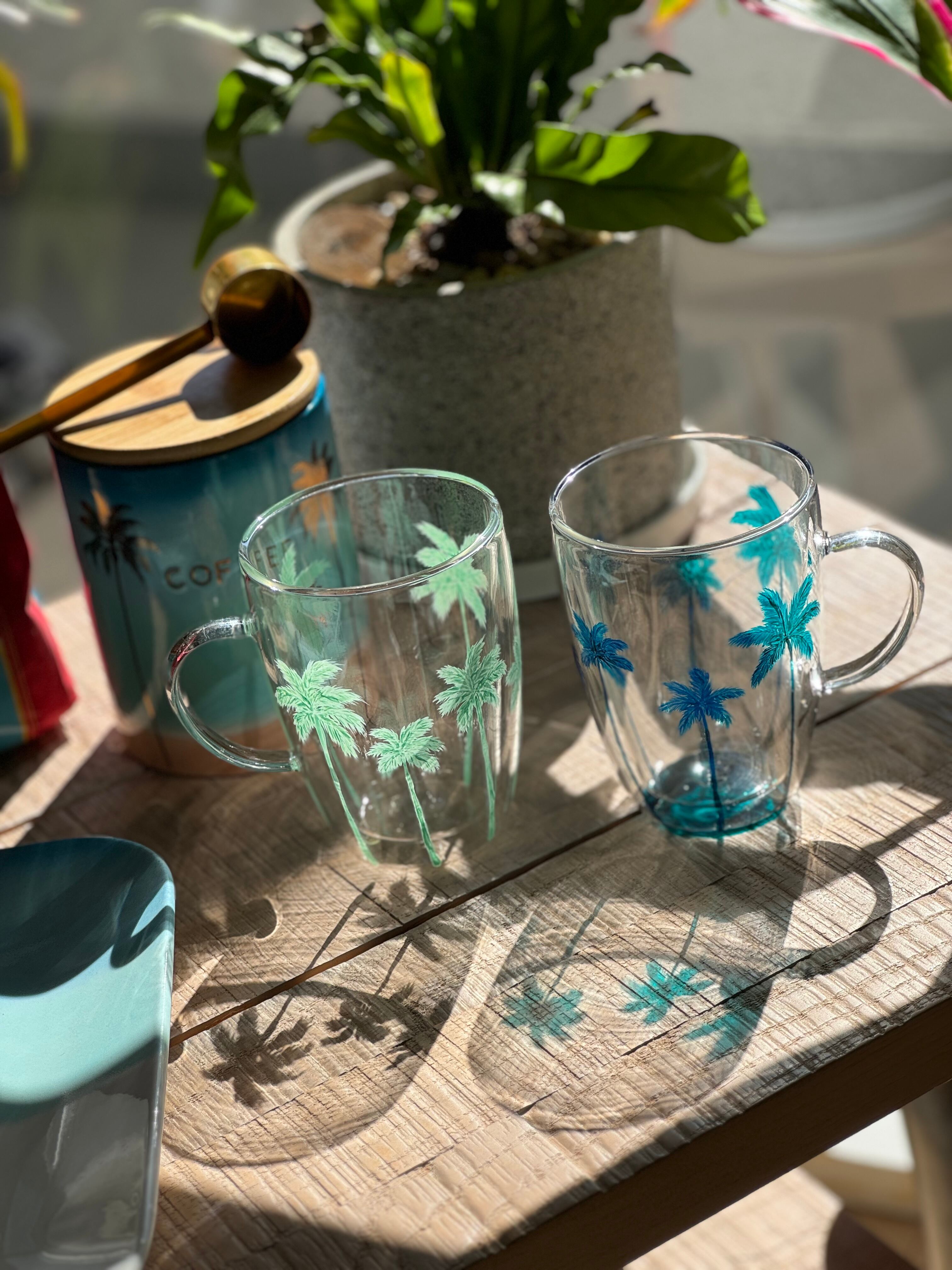 熱い飲み物を入れても安心の耐熱ガラスマグ。外側には可愛いパームツリーデザインが施され、リゾート気分を楽しめる一品です。