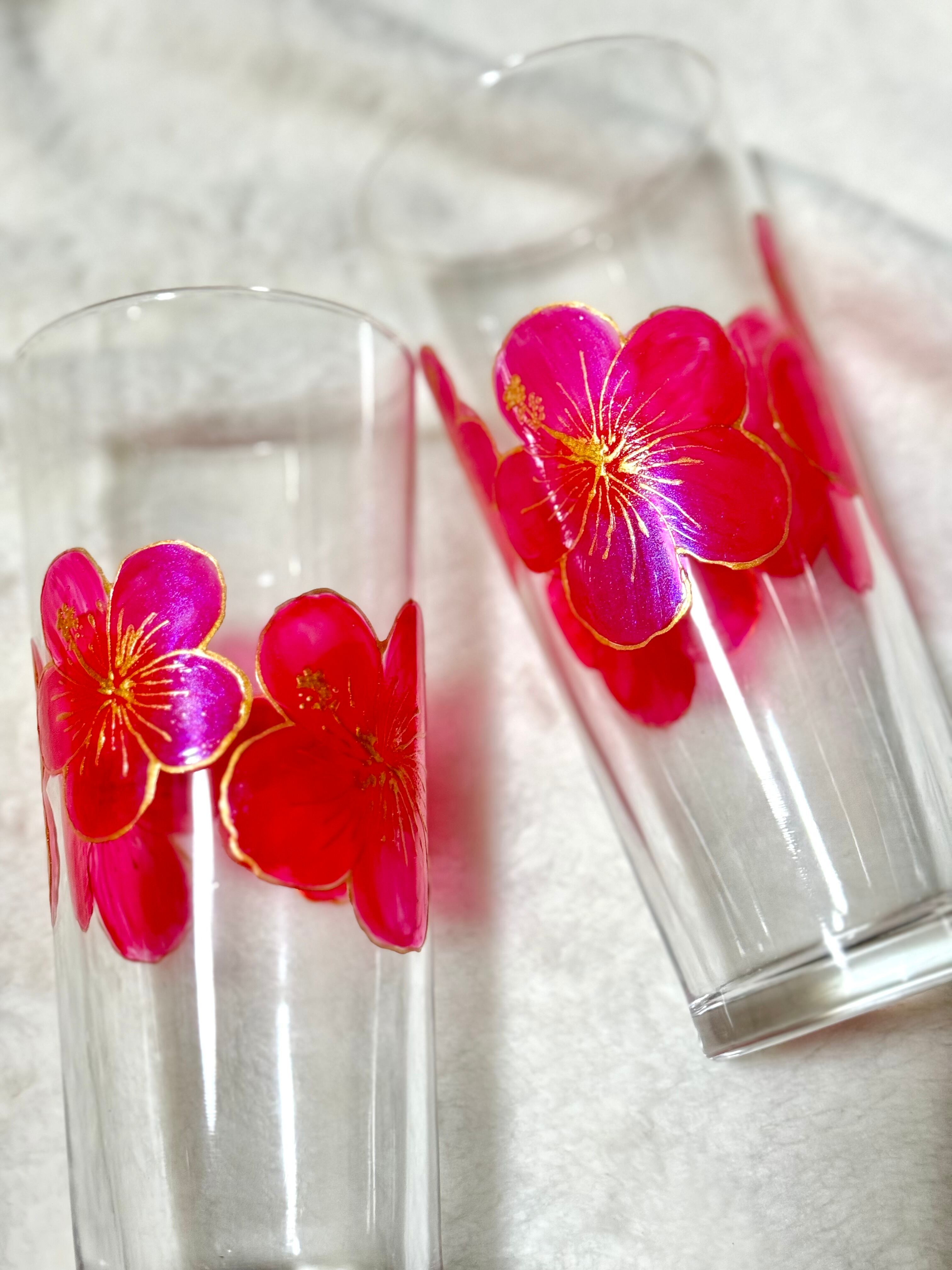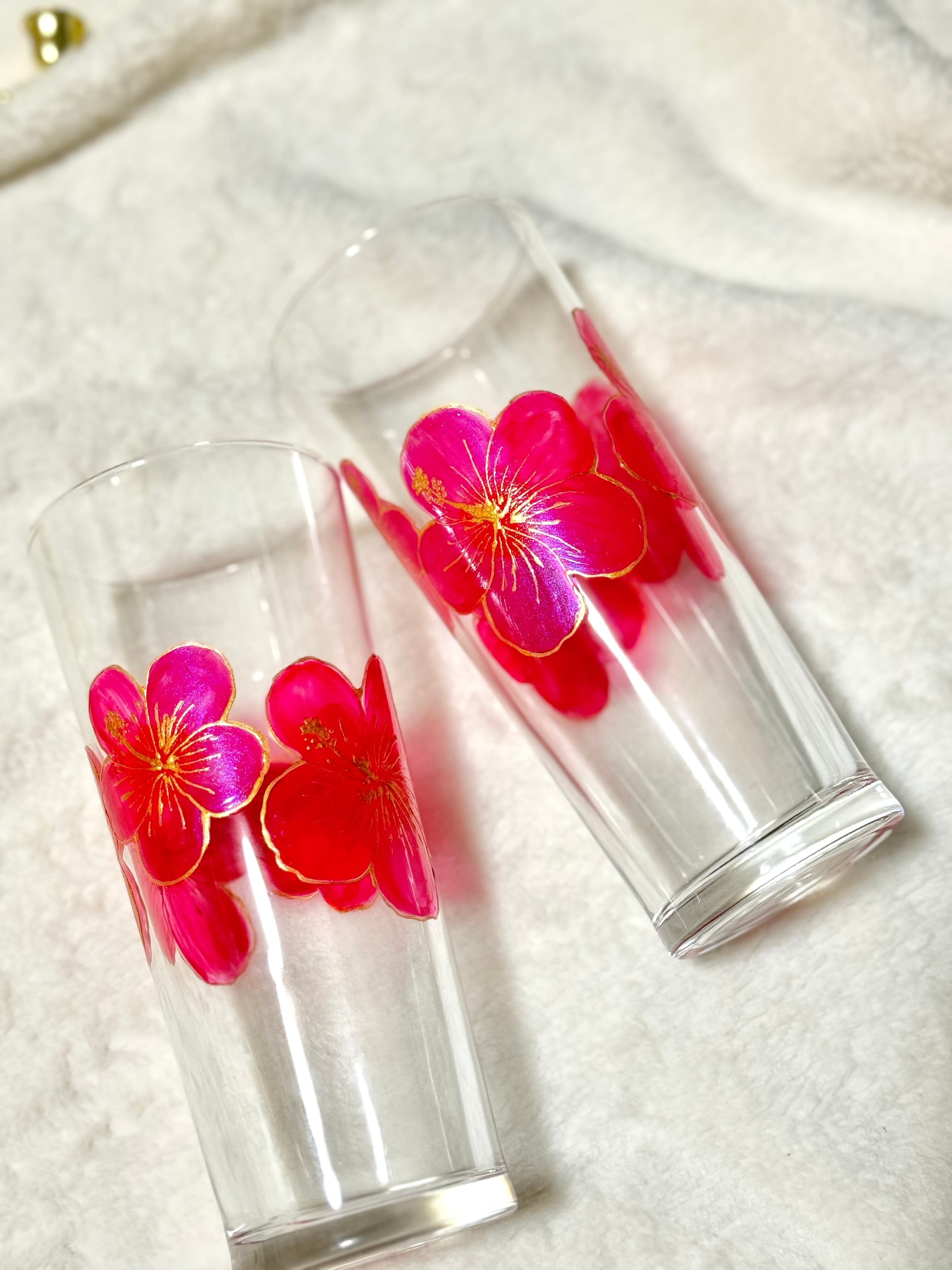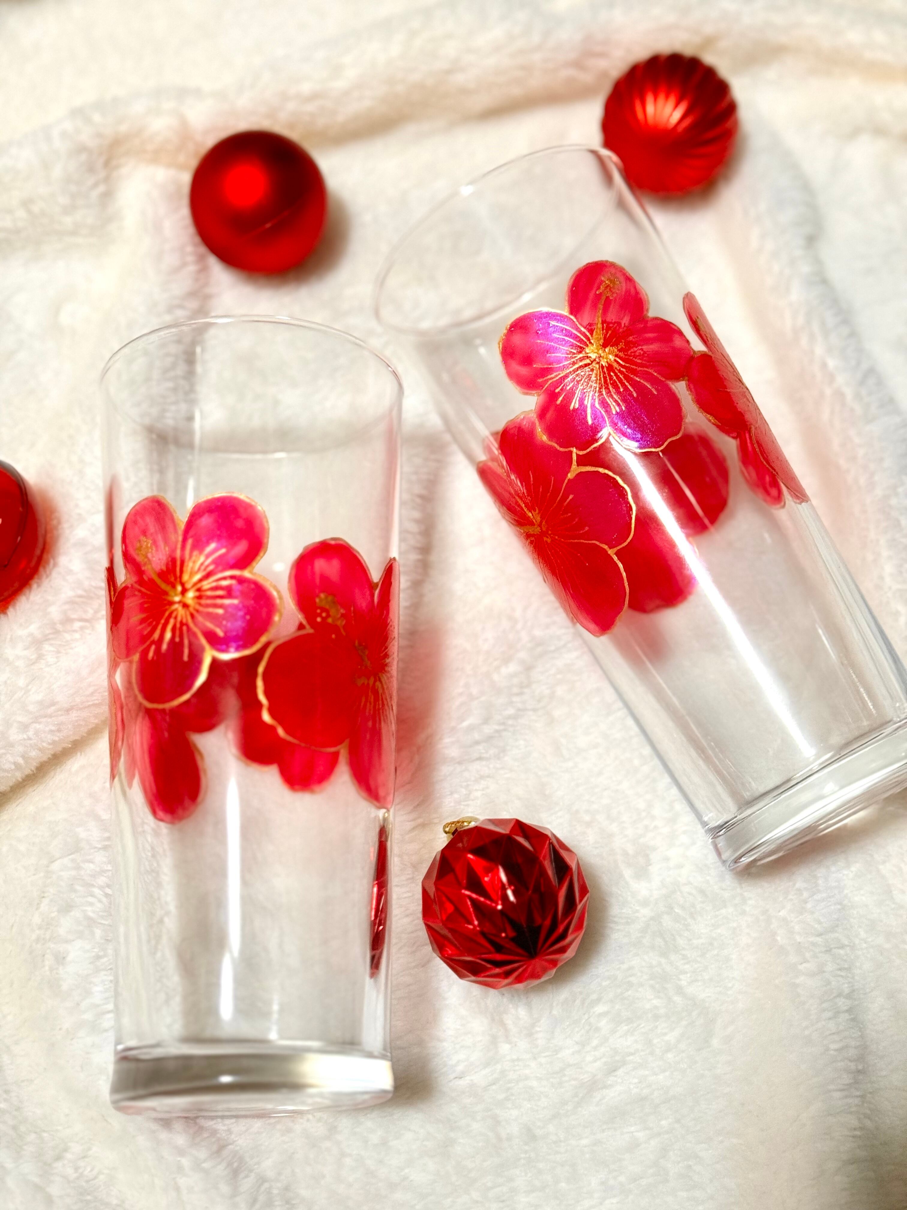 使いやすいロンググラスに手描きのレッドハイビスカスとゴールドのラインハイビスカス柄がぐるり1周入ったグラスです。