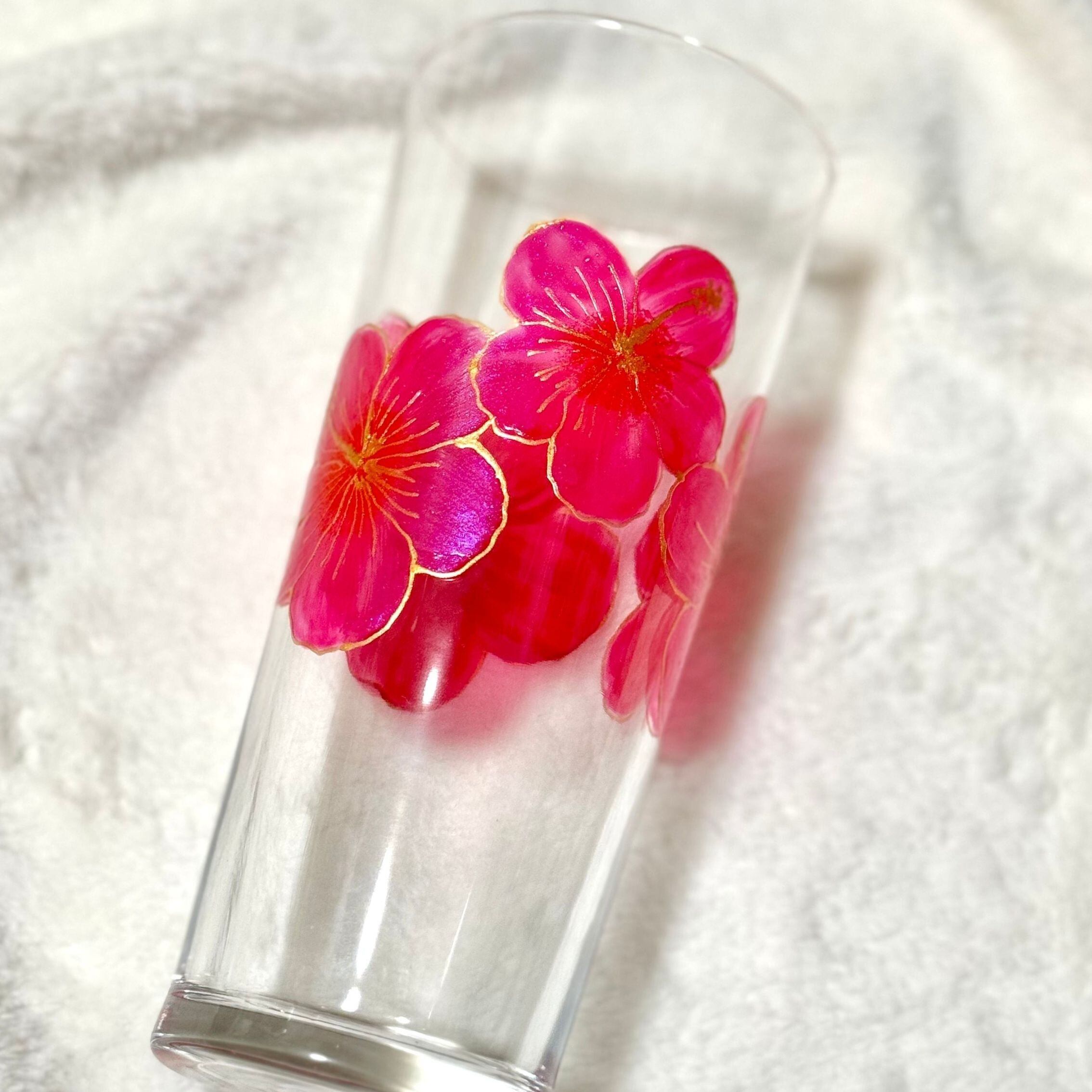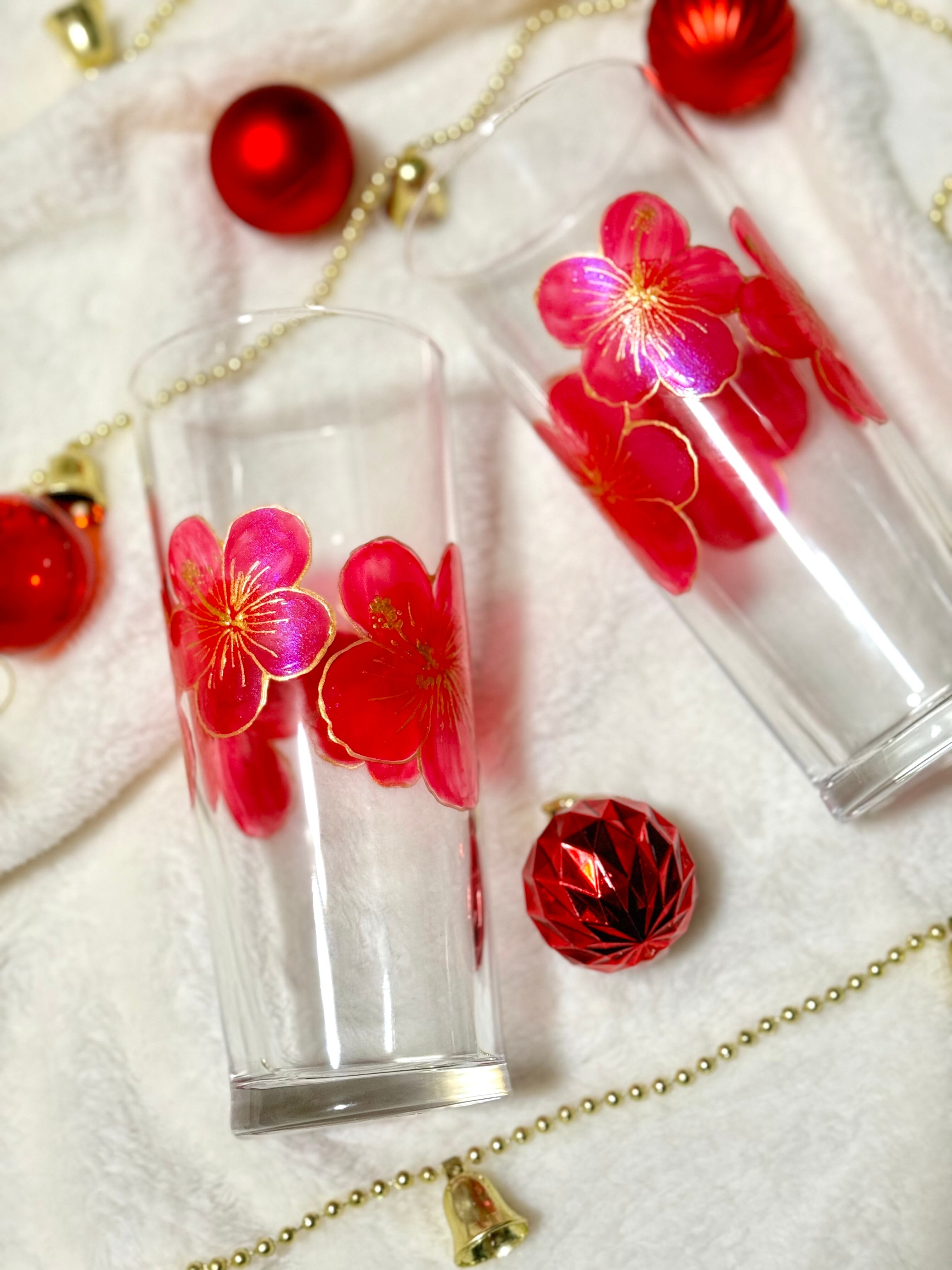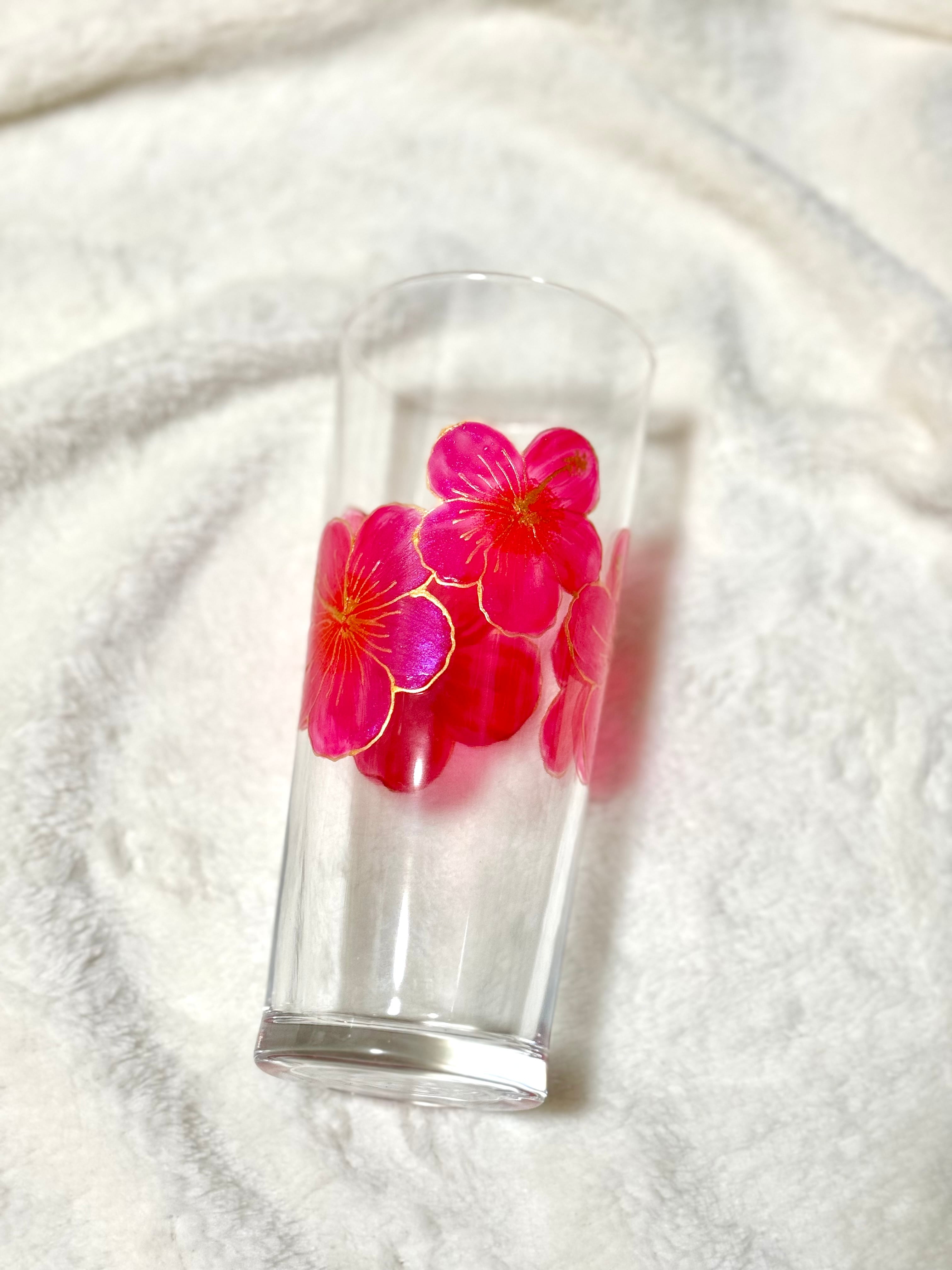 使いやすいロンググラスに手描きのレッドハイビスカスとゴールドのラインハイビスカス柄がぐるり1周入ったグラスです。