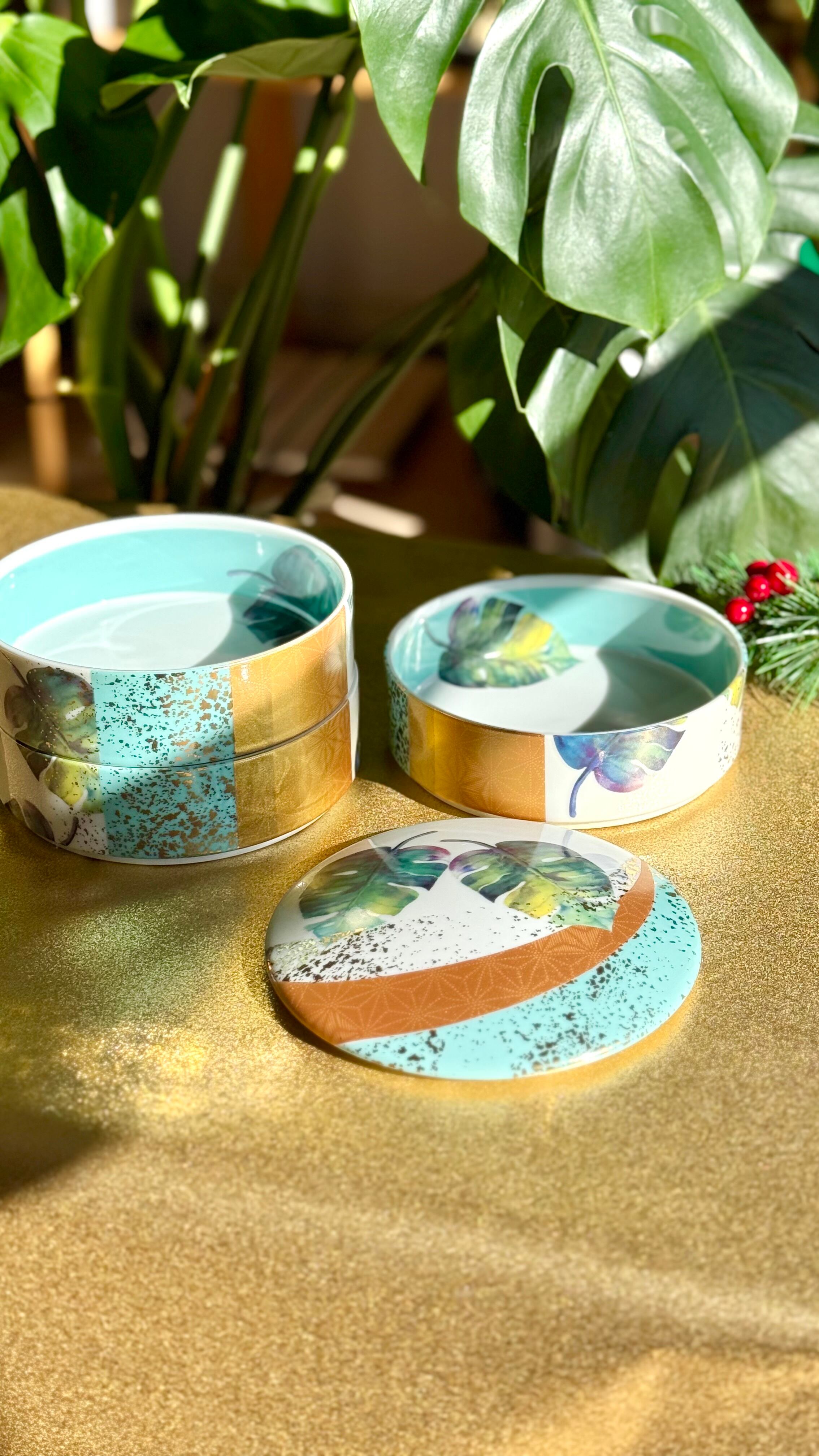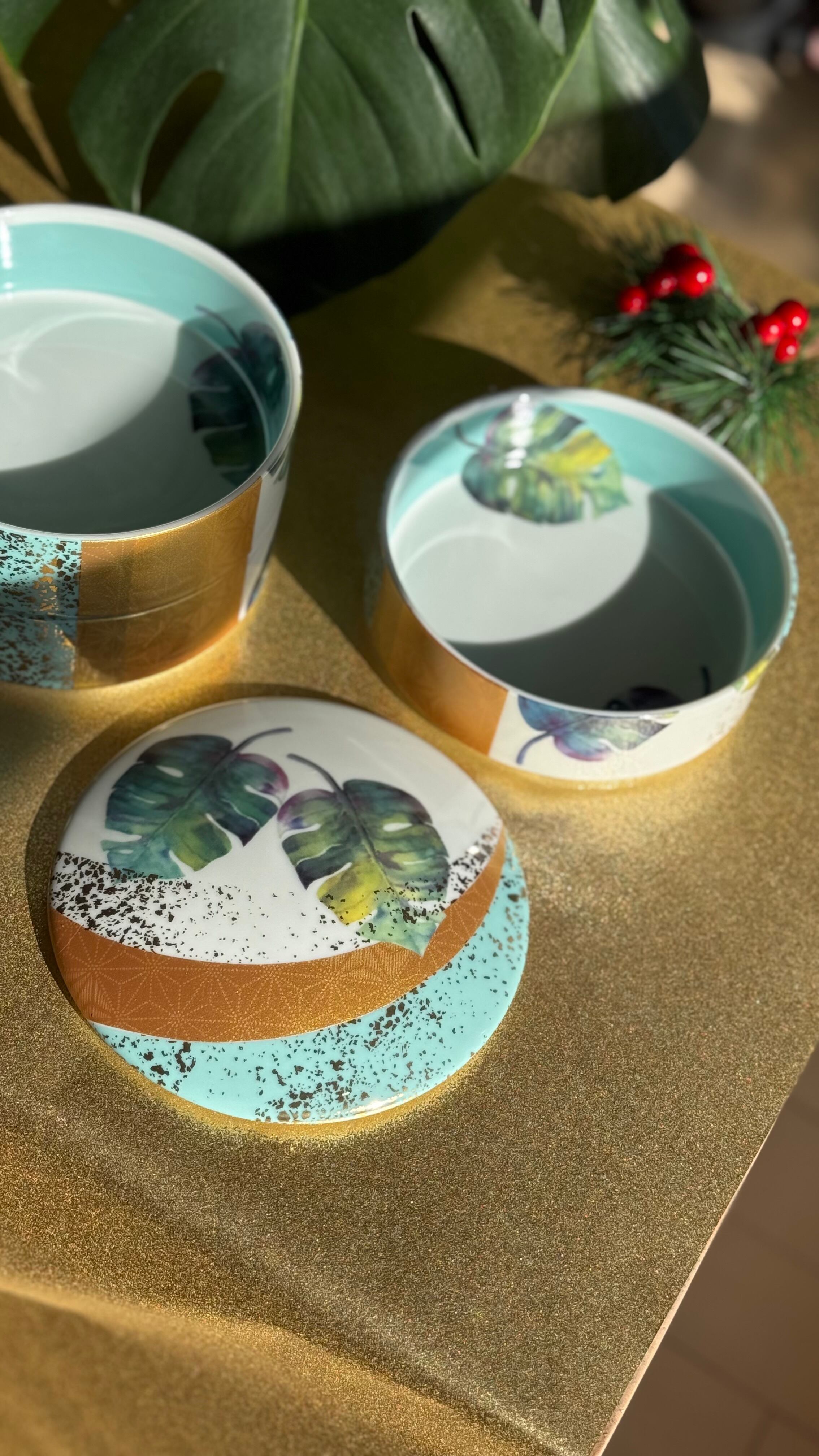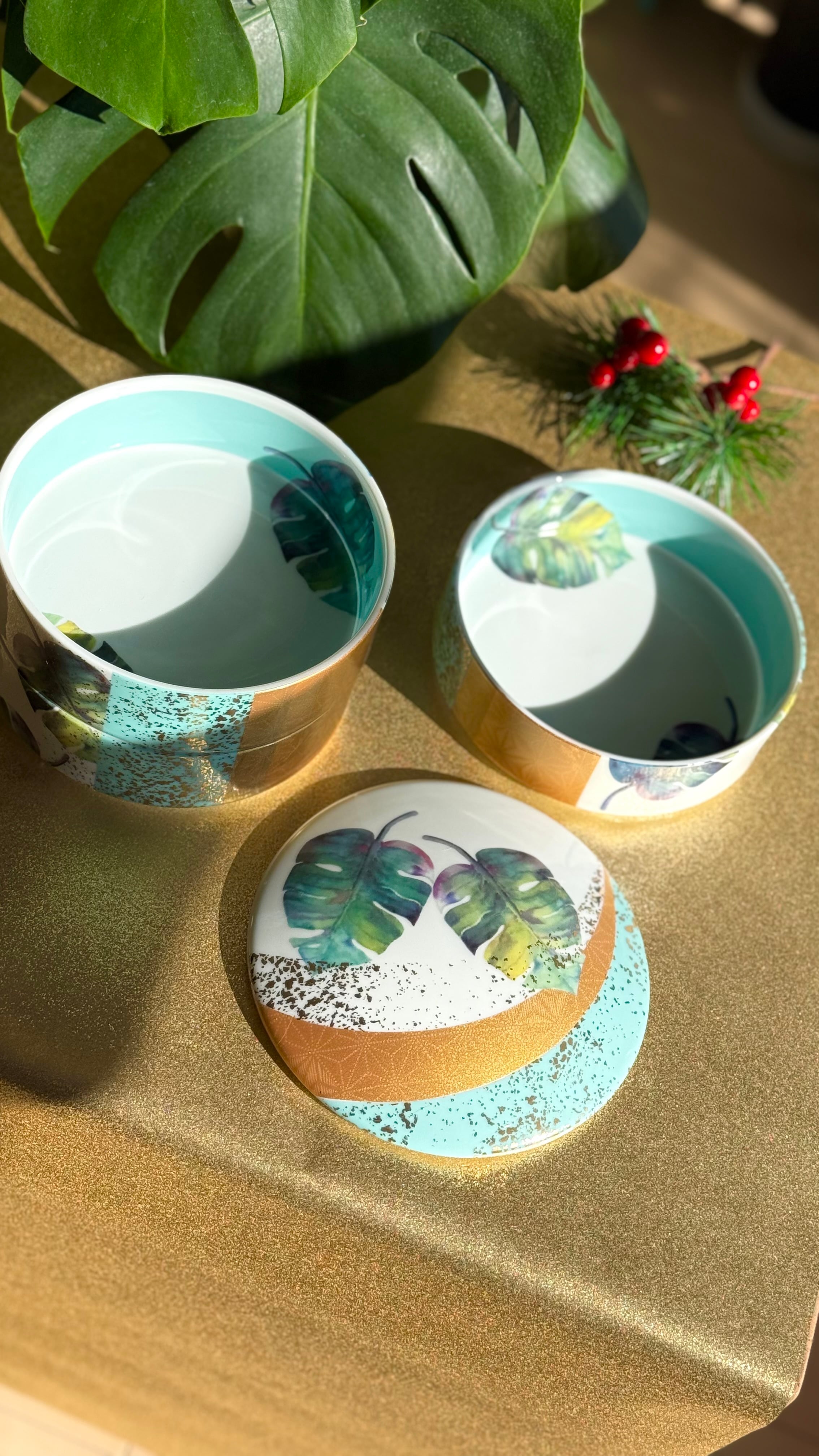 ハワイアンお重モンステラは、日常を特別に、そして特別な日をより華やかに演出するためにデザインされた素敵な商品です。温かみのある日本製の陶器素材に、ハワイの自然を感じるモンステラの美しさが映え、お料理を引き立てます。
